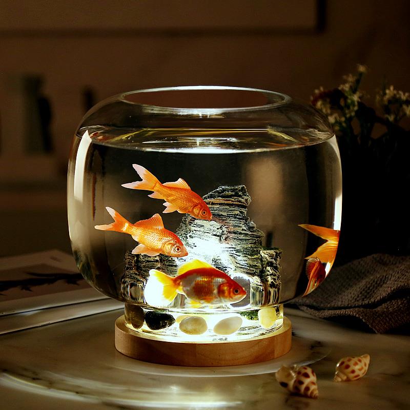 淘宝创意圆形玻璃热带小鱼缸生态观赏鱼缸桌面灯光假山缸招财全景水缸