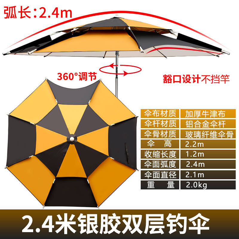 户外钓鱼伞——大钓伞加厚万向鱼伞,专为垂钓爱好者设计,采用双层防暴雨结构,外层高密度防水布有效抵御强风暴雨,内层透气防紫外线涂层,强力阻隔99%以上UVX线,防晒隔热效果出众。伞面宽大,遮阳面积充足,360°万向调节支架,可自由调节角度与高度,适应不同风向与日照方向。加厚铝合金骨架,抗风稳固,经久耐用。轻便易携,快速开合,无论是湖边、河边还是海边垂钓,都能为您提供持久舒适的遮阳避雨空间,是户外垂钓的理想伴侣。