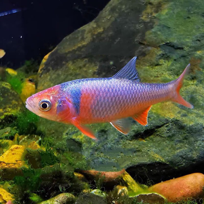 钻石彩虹鲫(又称紫光精灵、安哥拉鲫)是一种极具观赏价值的冷水群游鱼类,尤以红系瑰丽金丝品种最为出众。其体色绚丽,鳞片在光线下折射出钻石般璀璨光泽,游动时宛如彩虹流动,故得名“钻石彩虹鲫”。红系个体通体呈鲜艳橙红,搭配金丝般闪耀的侧线,更显华贵典雅。该品种适应性强,耐寒耐活,适合15–25℃水温,性情温和,喜群游,在水草丰茂的中大型水族箱中成群饲养,视觉效果震撼。对水质要求不高,易于饲养,是冷水观赏鱼中的优选,深受爱好者喜爱。
