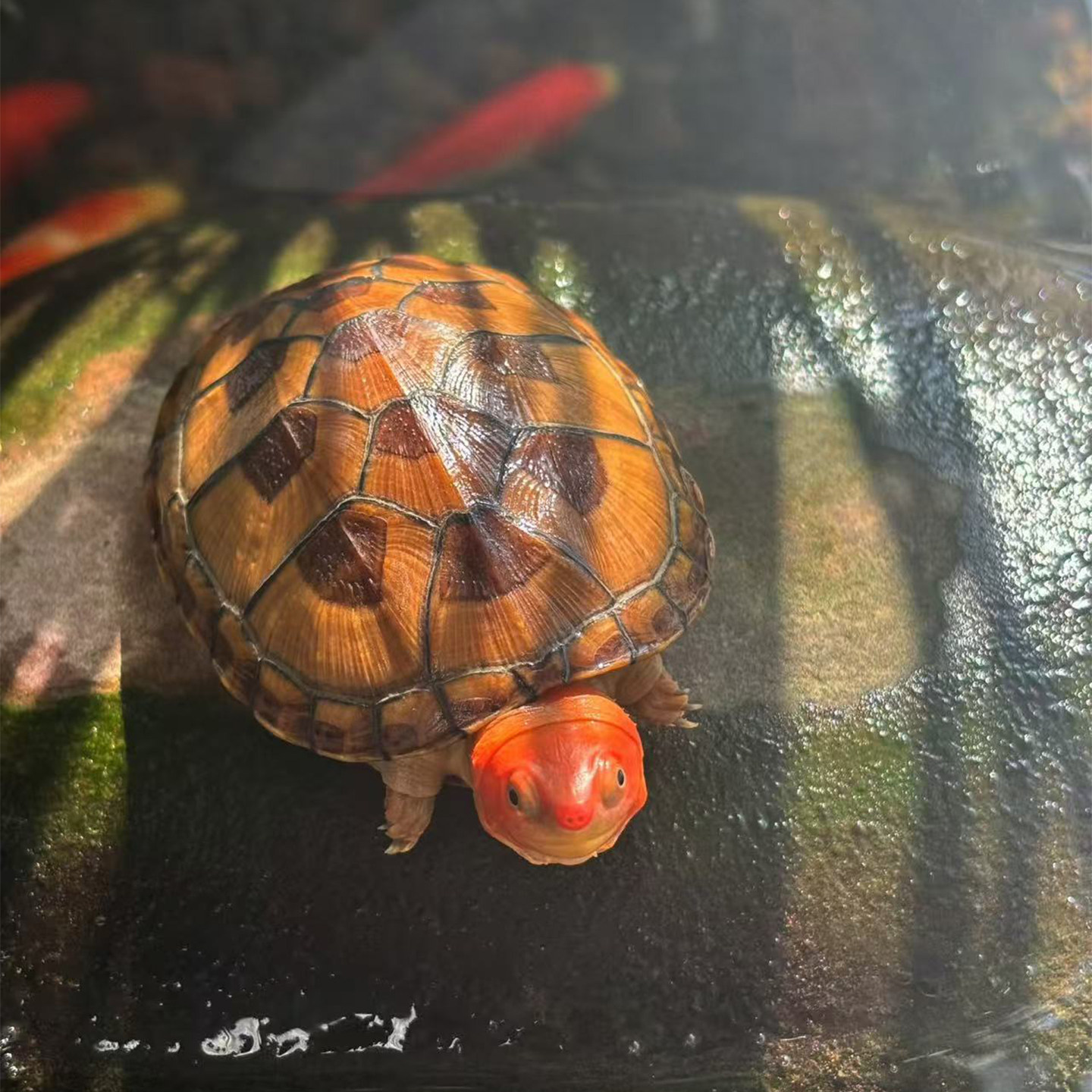 红面蛋龟是一种极具观赏价值的进口宠物龟,原产于中美洲,因其头部鲜红的斑纹和光滑圆润的背甲而备受喜爱。它属于深水龟,适应力强,对水质要求不高,非常适合新手饲养。红面蛋龟在适宜的光照与饮食条件下,发色效果显著,红面愈发鲜艳,有“招财龟”之美誉,寓意吉祥。其性格温和,互动性较好,日常管理只需提供过滤良好的水体、晒背灯及均衡饲料即可。作为中小型龟种,红面蛋龟兼具美观与易养特性,是观赏龟中的热门选择,深受龟友推崇。