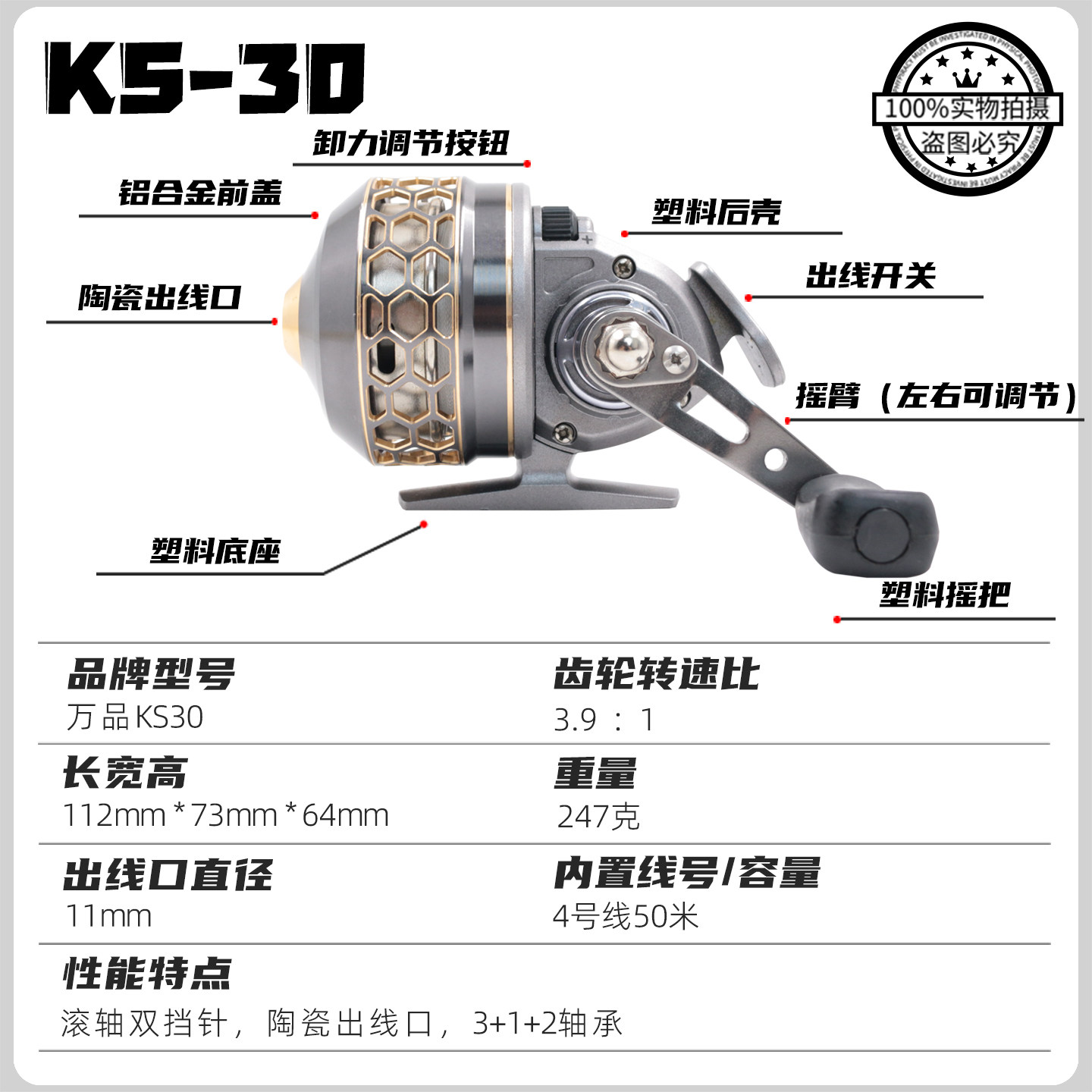万品30射鱼轮弹弓渔轮蓝鲸KS30是一款专为射鱼爱好者设计的高性能金属鱼线轮套装。采用坚固耐用的金属材质打造,结构稳定,抗腐蚀性强,适合淡水及海水环境使用。配备30米高强度鱼线,射程远、收线顺畅,搭配精准爽挡针设计,有效防止鱼线缠绕,提升抛投效率与命中率。弹弓式结构结合渔轮功能,兼具传统射鱼乐趣与现代便捷操作。KS30套装包含射鱼轮、弹弓、鱼线及辅助配件,一体式设计便于携带,适合户外垂钓、滩涂射鱼等场景。蓝鲸万品品牌保障品质,是射鱼新手与资深玩家的理想选择,助您轻松捕获目标鱼类,享受精准射鱼的畅快体验。