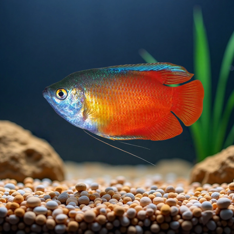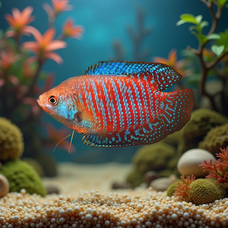 血丽丽鱼,又称五彩丽丽,是一种非常适合新手饲养的淡水观赏鱼。它色彩艳丽,体色多变,常见红、蓝、黄等斑斓色泽,极具观赏价值。作为小型热带鱼,血丽丽鱼性格温和,适应力强,对水质要求不高,能在较弱光照和无需打氧的环境中生存,非常适合草缸造景。它们食性杂,易投喂,繁殖简单,是理想的练手鱼种。只要保持水温在24-28℃,定期换水,即可健康生长。因其耐活好养、不打氧也能存活,深受水族爱好者喜爱,是入门级宠物鱼的优选之一。