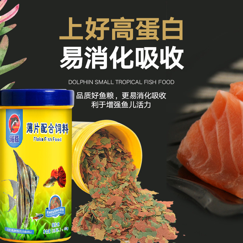 淘宝海豚牌鱼粮小型热带鱼配合饲料薄片颗粒孔雀凤尾三湖螺旋藻通用型