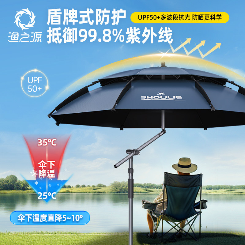 渔之源2025新款钓鱼伞,专为户外垂钓爱好者打造,集遮阳、防雨、便携于一体。采用高强度铝合金骨架与耐磨抗撕裂伞布,有效抵御风雨与紫外线,持久耐用。独特拐杖式设计,可稳固插入地面,解放双手;搭配可调节机械臂,轻松调整伞面角度,全方位遮挡阳光或雨水。伞面宽大,覆盖面积广,兼顾舒适性与实用性。折叠后小巧轻便,便于携带与收纳。无论是湖边、河边还是海钓,渔之源钓鱼伞都是您户外垂钓的理想伴侣,助您专注垂钓,尽享自然乐趣。