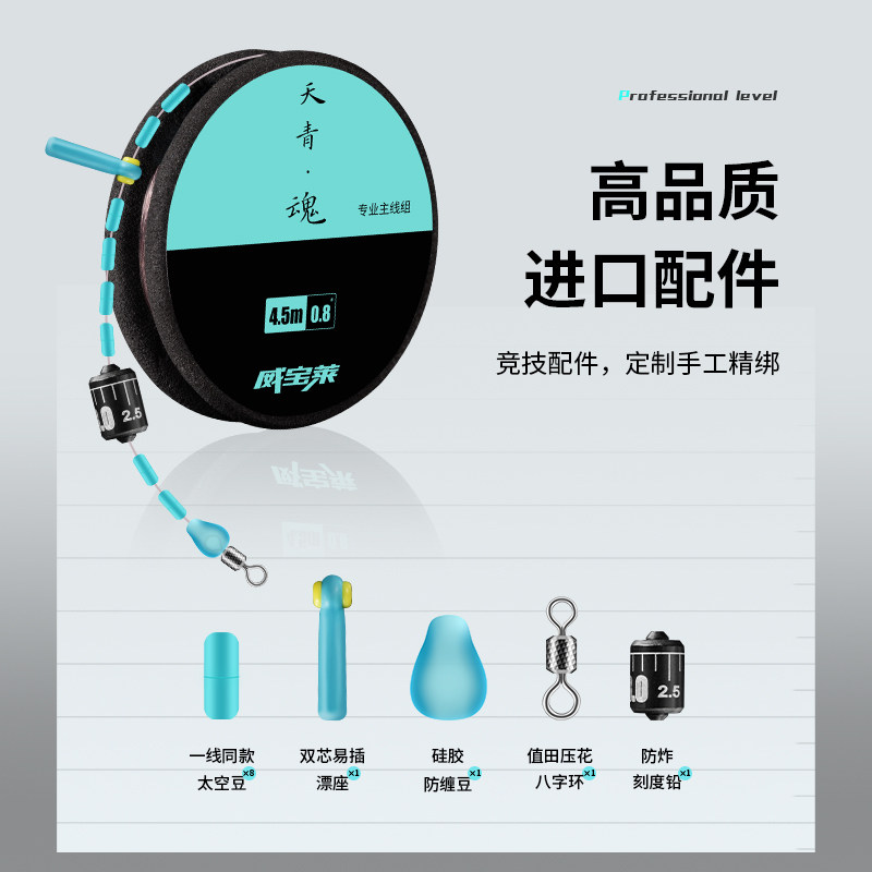 威宝莱无结主线组成品绑好主线套装,采用日本进口高品质尼龙材质,具备卓越的强拉力与耐磨性,有效减少断线风险。线体顺滑柔韧,结节强度高,确保抛投顺畅且不易打结。整套线组预先绑制完成,包含主线、八字环、太空豆等配件,即拆即用,极大提升垂钓效率。适用于淡水、海水多种作钓环境,兼容各类鱼种。无结设计减少阻力,增强灵敏度,让鱼讯传递更清晰。威宝莱专注细节工艺,为钓友提供可靠、便捷、高性能的线组解决方案,是休闲垂钓与竞技作钓的理想之选。