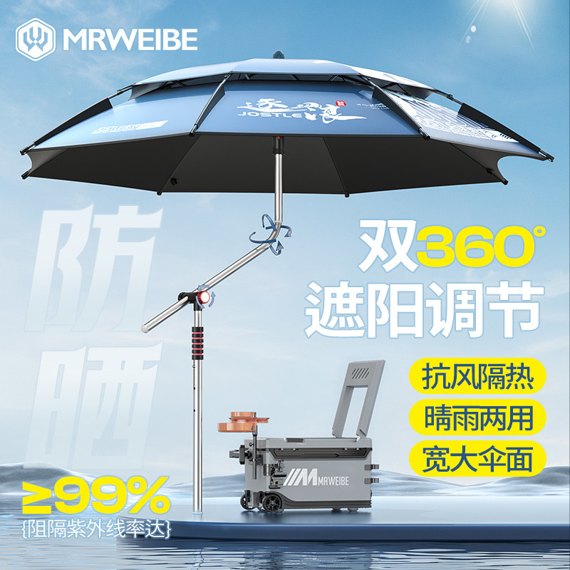 玛威贝2024新款万向大钓伞,专为户外垂钓爱好者设计,集防雨、遮阳、便携于一体。采用高强度铝合金骨架与双层防紫外线伞布,有效抵御风雨与烈日,UPF50+防晒等级,持久耐用。独特的万向调节系统,支持360°旋转及多角度倾斜,轻松应对不同风向与日照角度。加粗中棒搭配可伸缩拐杖式设计,稳固支撑且便于携带,适合沙滩、湖泊、河边等多种地形。伞面直径达2.4米,提供宽敞遮蔽空间,底部设有防风绳与地钉固定孔,抗风性能优异。无论是雨天垂钓还是烈日暴晒,玛威贝钓鱼伞都是您可靠的户外伴侣。