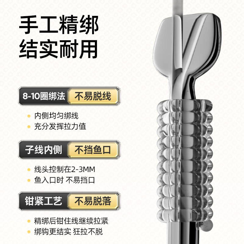 创威非凡大师伊势尼鱼钩正品绑好防缠绕套装,专为野钓爱好者精心打造。采用优质高碳钢材质,钩尖锋利、强度高,耐腐蚀性能优异,确保长时间水下作业依然保持卓越性能。子线选用进口PE线,柔韧顺滑,有效防止缠绕,提升抛投顺畅度。双钩设计增加中鱼概率,特别适合钓鲫鱼、鲤鱼等常见淡水鱼种。线组已专业绑制,结实耐用,即拆即用,省时省力。搭配透明包装,便于收纳与携带。无论是新手还是资深钓友,这款套装都能在野钓中提供稳定可靠的作钓体验,是户外垂钓的理想之选。