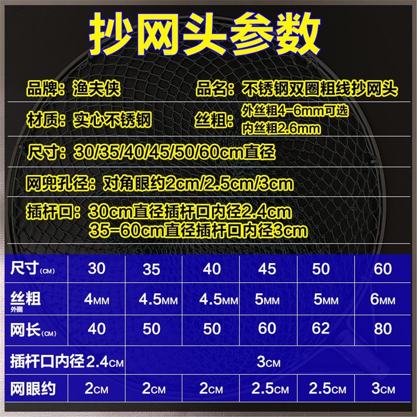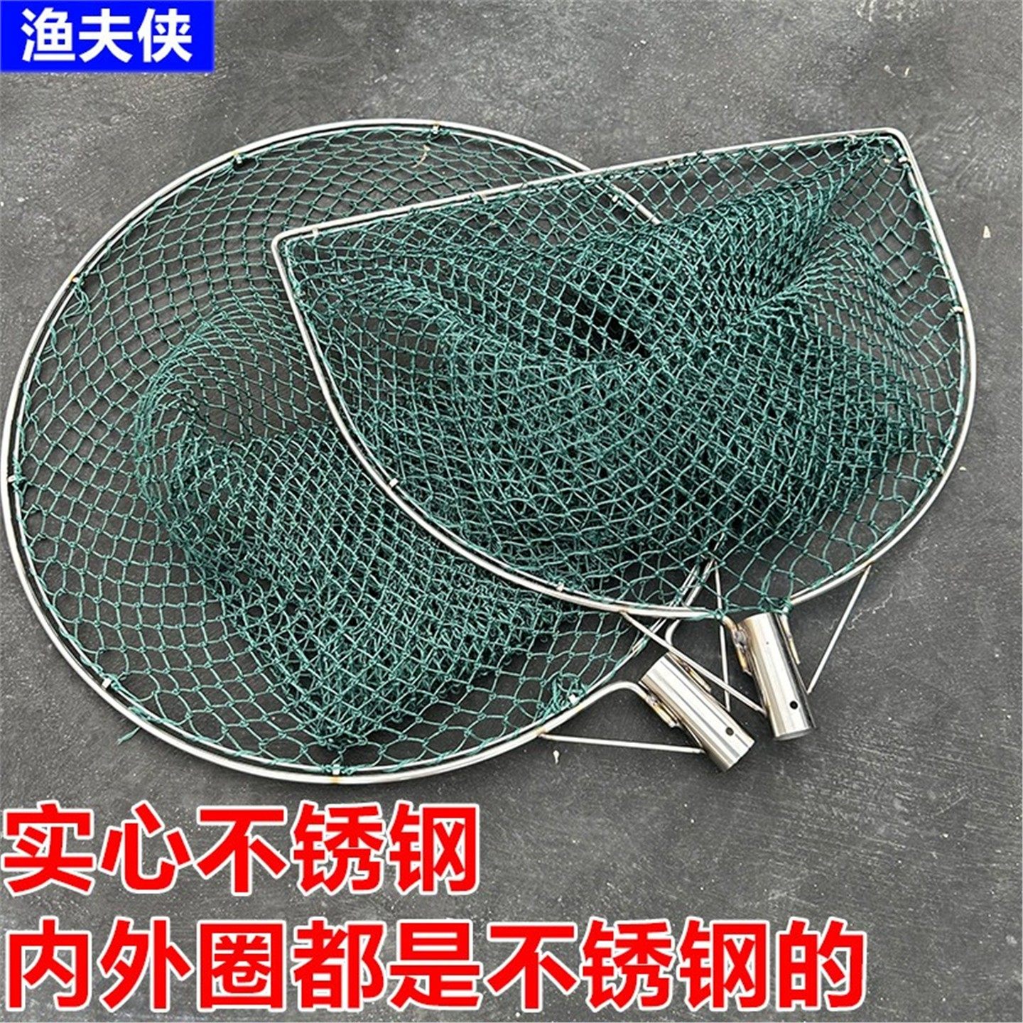 淘宝实心双圈防磨不锈钢抄网头加粗手工网兜捞鱼网大物抄网抄鱼捞鸭网