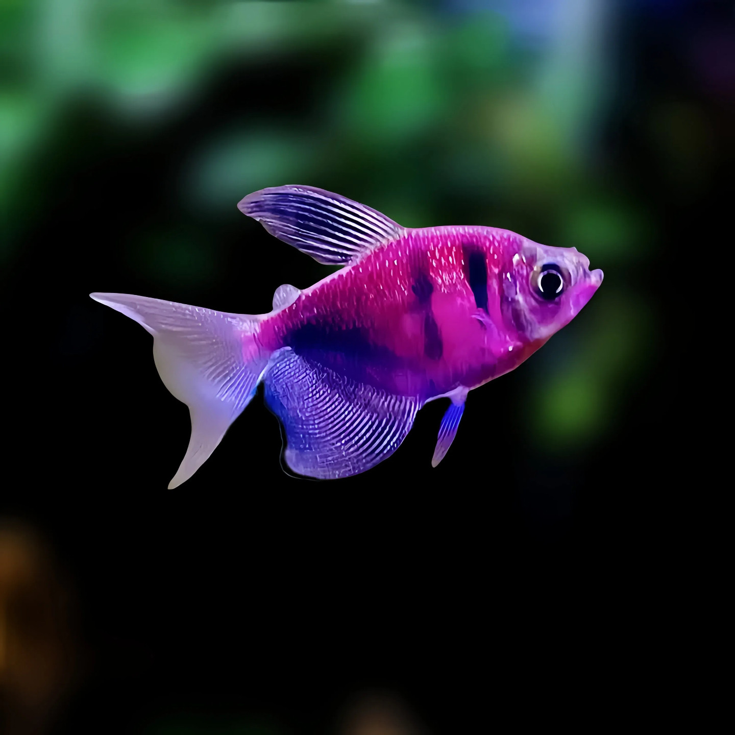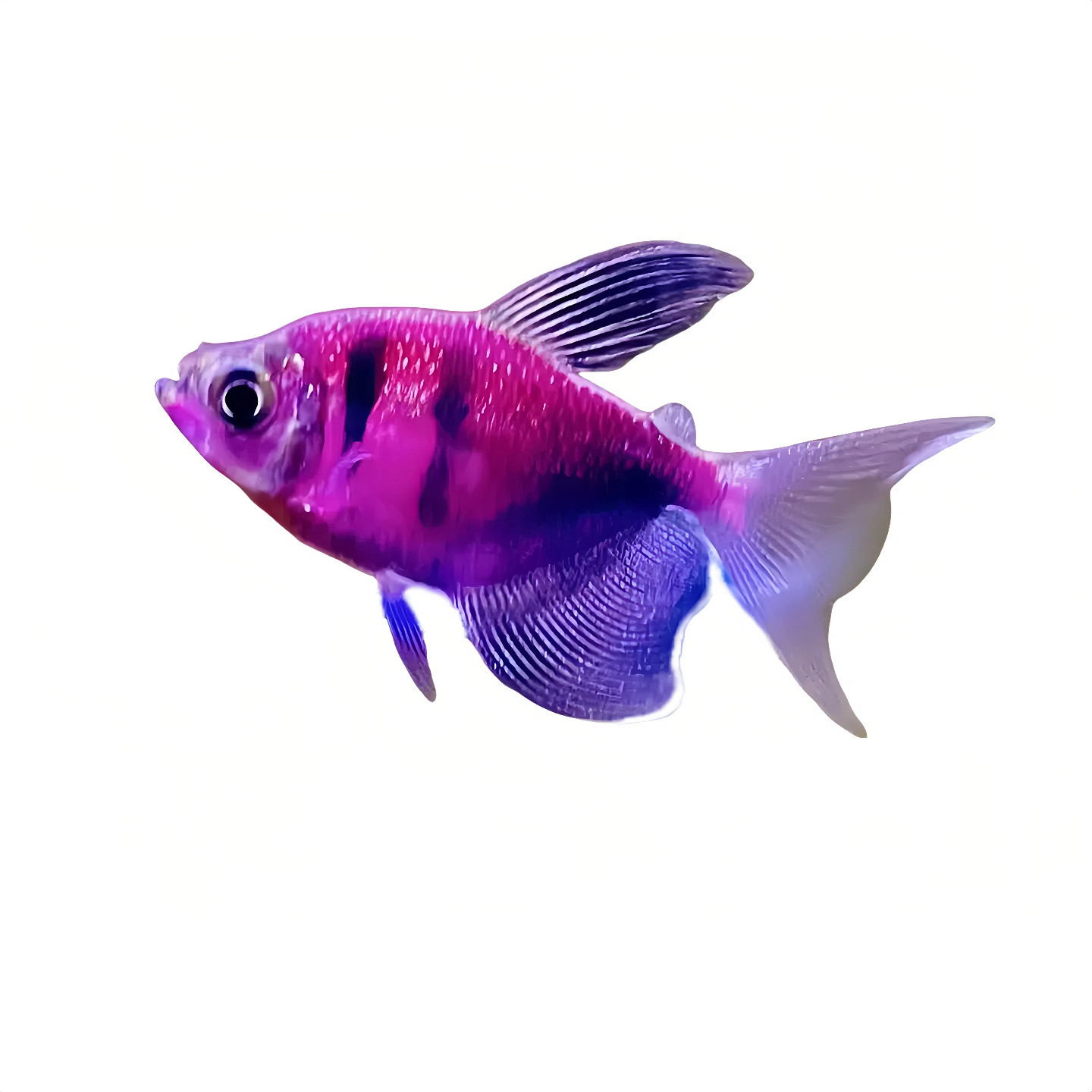 紫老虎天使鱼(又称虎皮天使鱼)是一种色彩艳丽、体态优美的小型淡水热带观赏鱼,因其体表带有独特的紫色与黑色虎纹斑纹而得名。原产于南美洲亚马逊流域,适应力强,性情温和,适合初学者饲养。它对水质要求不高,耐活好养,在pH 6.0–7.5、水温24–28℃的环境中即可健康生长。食性杂,可摄食人工饲料、红虫、丰年虾等。成鱼体长约8–12厘米,群养或单养皆宜,搭配水草造景更显其优雅灵动。紫老虎天使鱼不仅观赏价值高,且繁殖相对容易,是水族爱好者喜爱的经典品种之一,为水族箱增添一抹神秘而热烈的热带风情。