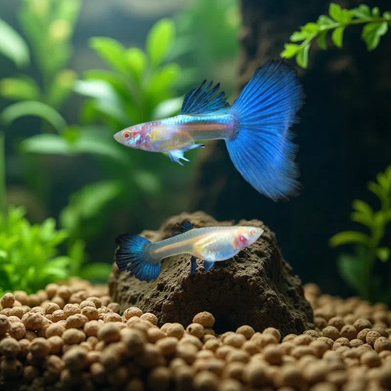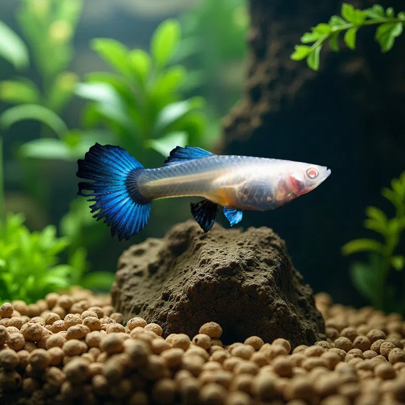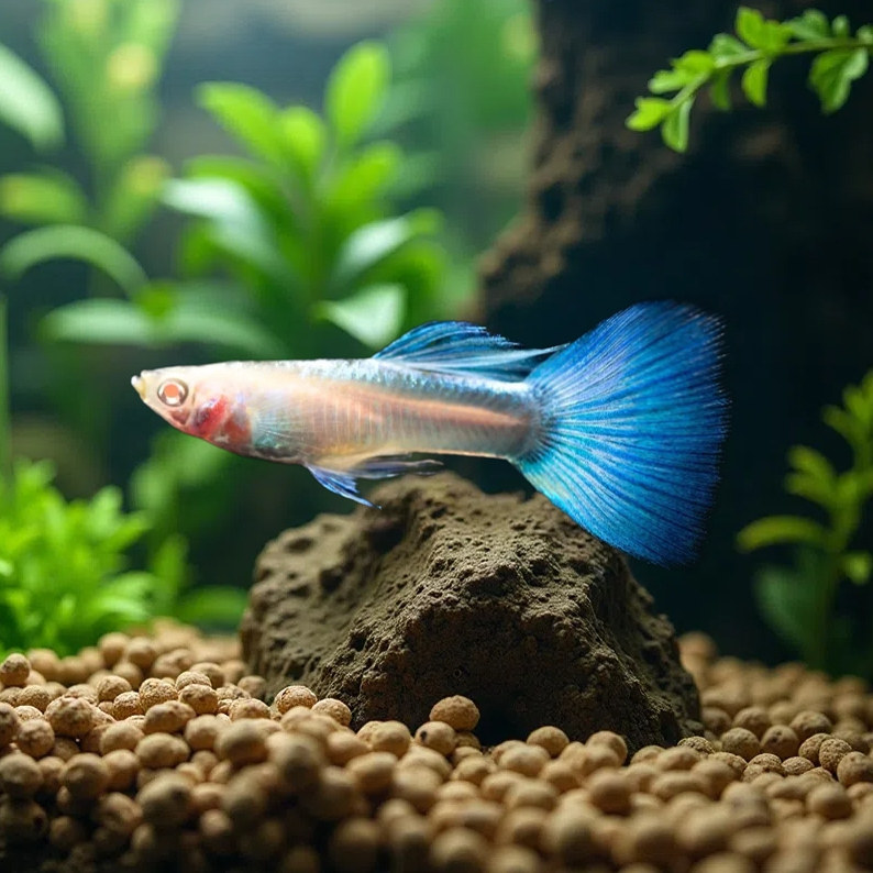 天空蓝孔雀鱼是一种色彩艳丽、体型小巧的热带淡水观赏鱼,因其雄鱼体色如天空般湛蓝、尾鳍展开似孔雀开屏而得名。它们属于胎生鱼类,无需产卵即可直接生下小鱼,繁殖能力强,非常适合新手饲养。孔雀鱼适应力佳,对水质要求不高,能在较宽的温度范围(22-28℃)内健康生活。性格温和,喜群居,可与其他小型温和鱼类混养。喂食简单,普通热带鱼饲料即可满足需求。因其美丽的外形和易养的特性,天空蓝孔雀鱼成为水族爱好者入门的首选,尤其适合家庭水族箱观赏,为居室增添灵动与生机。