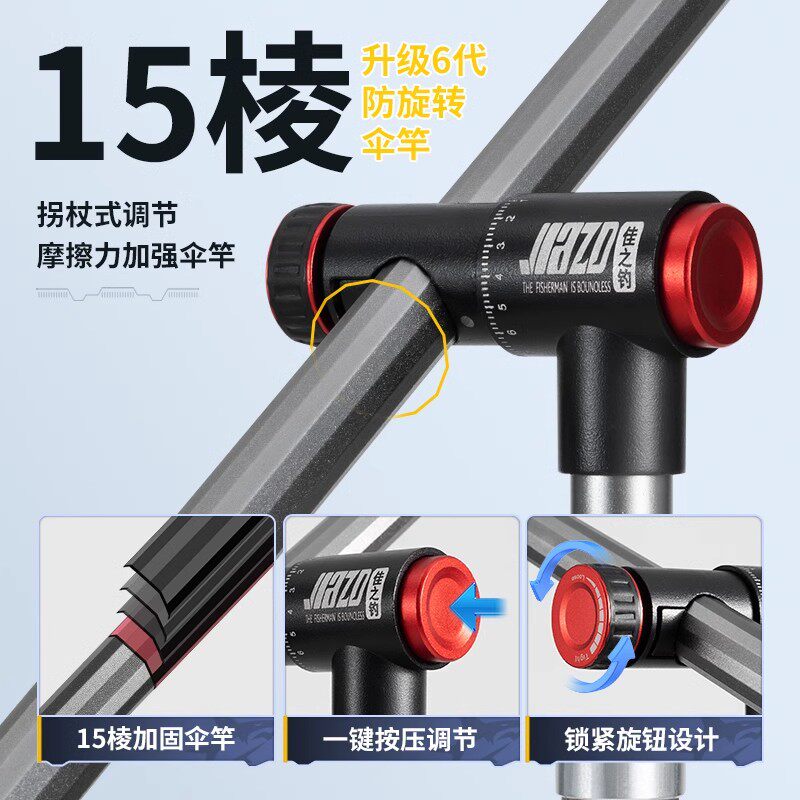 佳之钓2026新款大钓伞,专为户外垂钓爱好者精心打造。采用高强度铝合金骨架与防撕裂防水面料,稳固抗风、持久耐用。超大伞面设计,提供宽阔遮阳空间,有效阻挡紫外线,防晒指数UPF50+,烈日下也能清爽作钓。独特三用设计,既可作遮阳伞,又能搭配钓箱使用,还可作为临时拐杖,一伞多用,便携实用。伞骨结构稳固,抗风性能优异,适应多种复杂天气。底部配备可调节地钉与绑带,固定更牢靠。无论是湖边、河边还是海钓,佳之钓大钓伞都是您户外垂钓的理想伴侣,让垂钓更舒适、更安心。