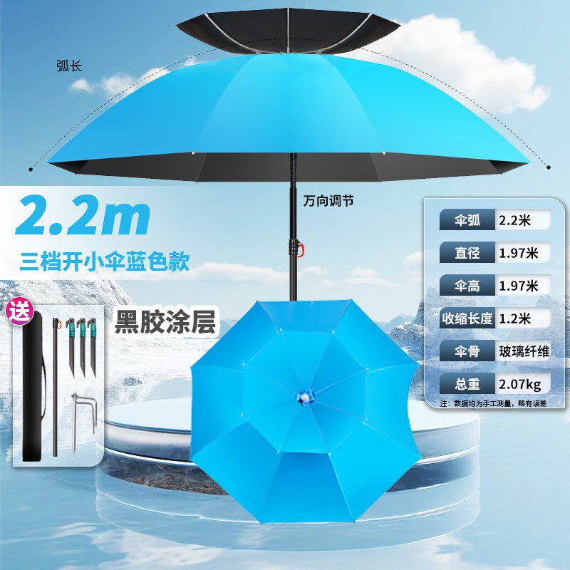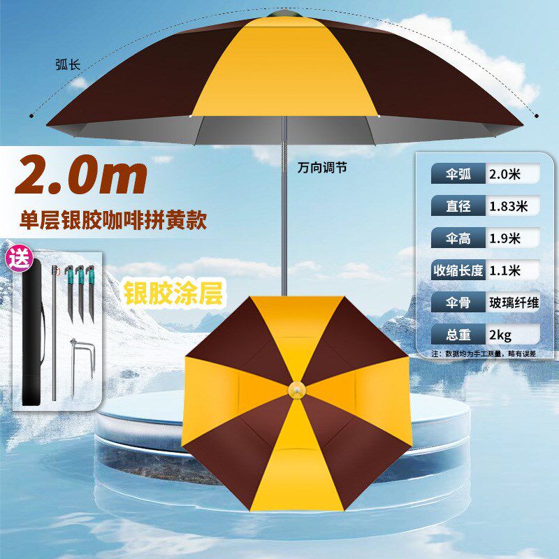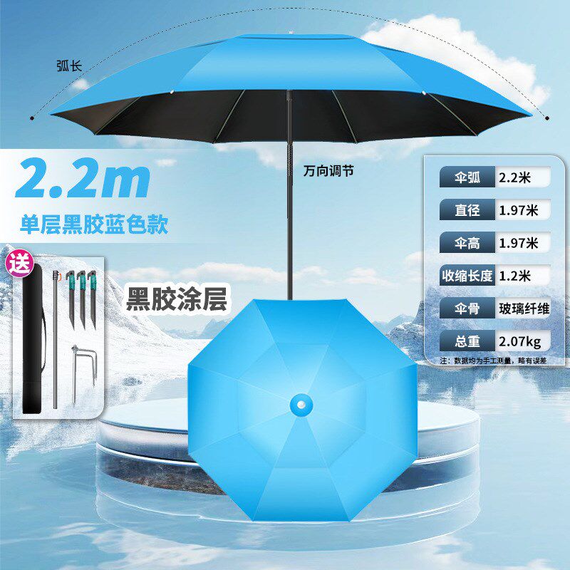 新款大钓伞万向户外遮阳伞专为野钓爱好者设计,集防雨、防晒、便携于一体。采用加厚黑胶涂层伞面,有效阻隔紫外线,防晒指数高达UPF50+,同时具备优异的防水性能,应对突发降雨轻松自如。伞骨选用高强度玻璃纤维材质,轻盈坚韧,抗风性能出色。独特的万向调节设计,可360°自由旋转并多角度倾斜,轻松遮挡不同方向的阳光与风雨。底部配备稳固拐杖式支撑结构,插入地面即可固定,解放双手,专注垂钓。伞面直径达2.4米,覆盖范围广,适合单人或双人使用。无论是烈日暴晒还是阴雨天气,这款钓鱼伞都能为您提供舒适、安全的垂钓环境,是户外野钓的理想伴侣。