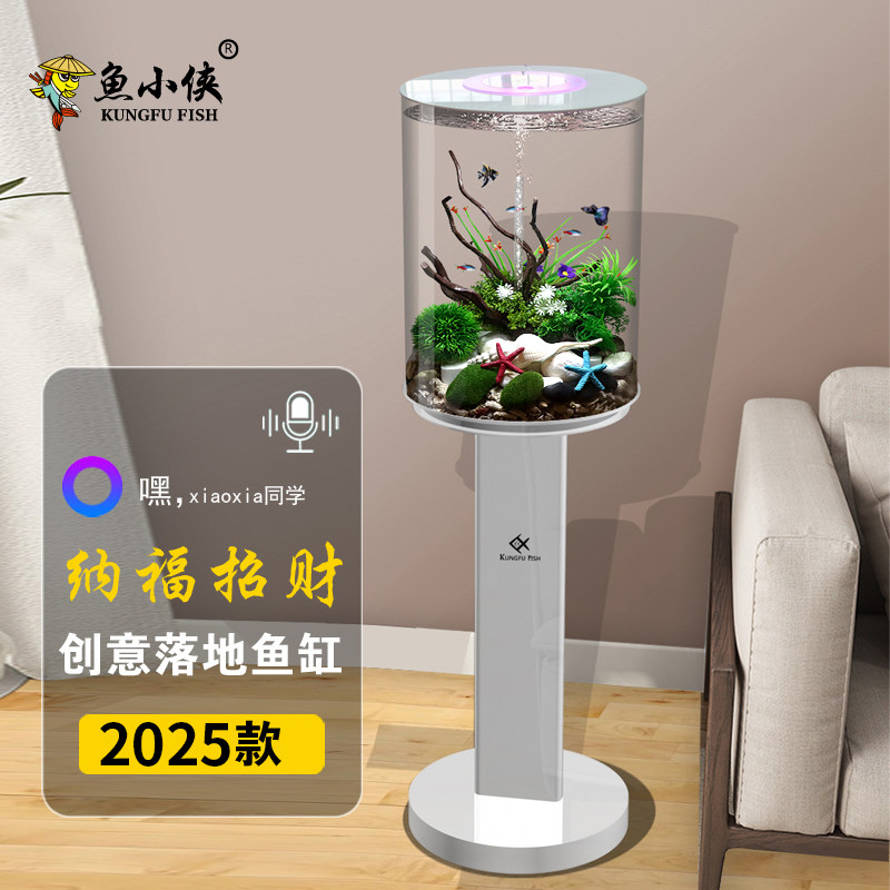 2025新款鱼缸过滤制氧一体机,集美观与实用于一体,专为现代家庭客厅设计。采用高品质透明玻璃打造圆形落地式水族箱,360°全景视野,尽显金鱼灵动之美。内置高效静音过滤系统与智能增氧装置,实现水体循环净化与持续供氧,营造健康稳定的生态水环境。配备LED柔和照明,提升观赏效果,同时支持手机APP远程调控,操作便捷。小巧精致却不失大气,完美融入家居风格,是养鱼新手与爱好者的理想之选。不仅美化空间,更带来自然静谧的生活体验,让家更有生机与温度。