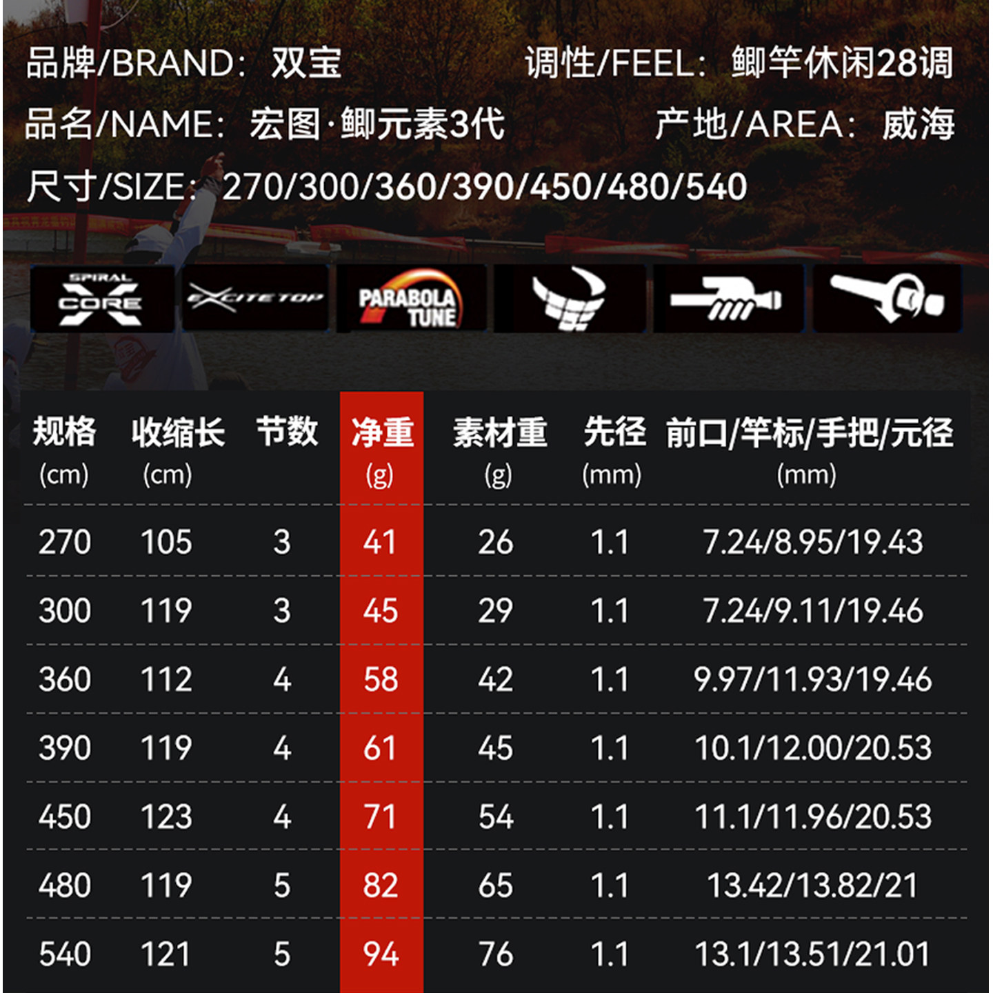 双宝鲫元素鲫鱼竿是一款专为钓鲫鱼设计的极轻量鱼竿,采用高吨位碳布材质打造,具备超轻、超细、超硬三大核心优势。竿体轻盈,持感舒适,长时间作钓不易疲劳,同时保持了出色的强度和韧性。其小综合调性设计,兼顾灵敏度和控鱼能力,适合应对不同水域环境下的鲫鱼作钓需求。导环排列科学,出线顺畅,有效减少摩擦损耗。整体做工精细,涂装简约大气,是追求轻量化与高性能的钓友的理想选择。无论是野钓还是黑坑,双宝鲫元素都能带来极致的垂钓体验。