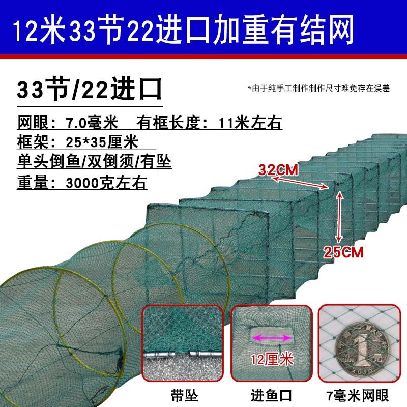 加大框2-30米专业折叠捕鱼笼,专为高效捕捞设计,适用于河流、湖泊及近海水域。采用高强度加厚钢丝框架与耐磨聚乙烯网布,结构稳固、抗拉扯,使用寿命更长。独特“只进不出”入口设计,利用鱼类趋食性,确保鱼虾龙虾进入后难以逃脱。笼体可折叠,收纳体积小,便于携带与存放,适合渔民、垂钓爱好者及养殖用户。2-30米多种长度可选,满足不同作业需求。广泛用于捕捞鲫鱼、鲤鱼、小龙虾、河虾等淡水水产,操作简便,收网高效,是传统地笼的升级之选,提升捕捞效率的同时兼顾环保与可持续性。