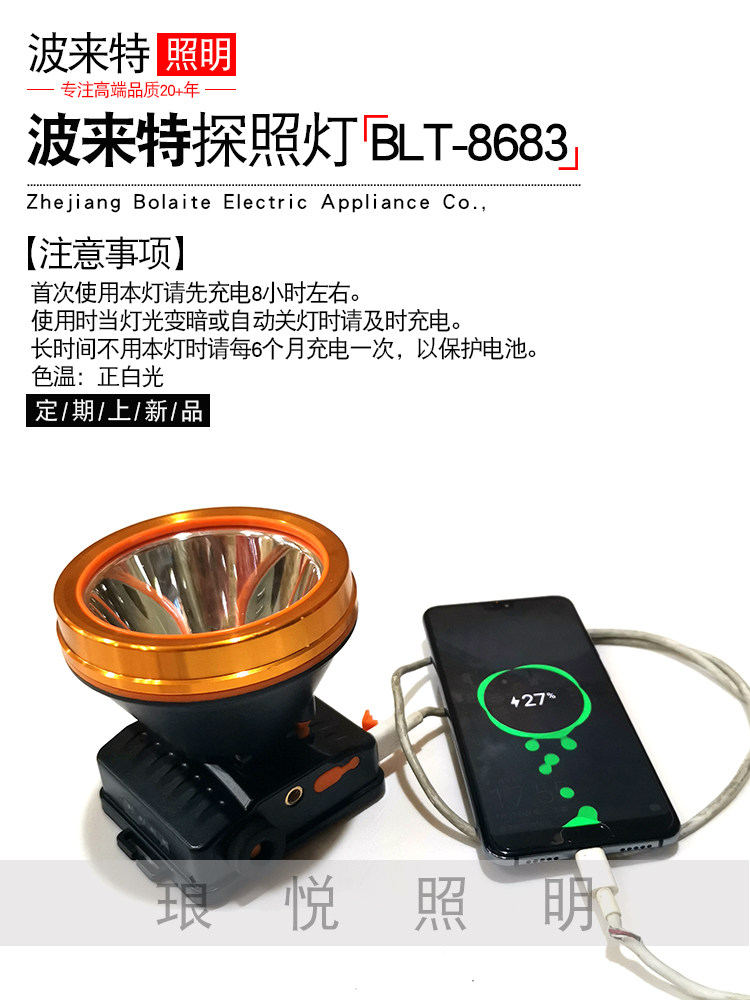 淘宝波来特锂电头灯8683强光 USB口手机充电防水头戴式超亮钓鱼灯手电