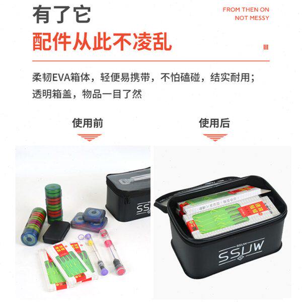 ssuw新款多功能配件收纳钓鱼桶,集实用性与便携性于一体,专为垂钓爱好者精心设计。采用加厚EVA材质,防水耐磨,结实耐用,有效保护内部渔具。桶身可折叠收纳,节省空间,携带方便。内置多层分隔与弹性固定带,可整齐收纳鱼钩、浮漂、铅坠、剪刀等小配件,避免杂乱丢失。顶部设有提手与肩带,支持手提或斜挎,户外使用更轻松。同时兼具装鱼功能,密封性好,保活保鲜。无论是野钓、台钓还是路亚,这款多功能渔具收纳桶都能满足您的多样需求,是钓鱼出行的理想伴侣。