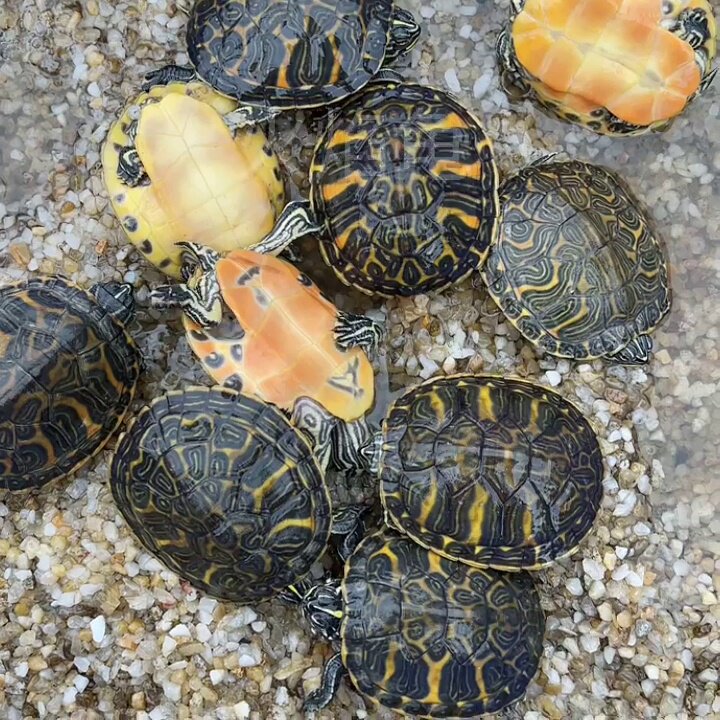 冷水纯种极品宽纹火焰龟(实为红耳龟变种,非真正“火焰龟”)是近年来观赏龟市场中的热门品种。其背甲具鲜明宽幅红黄相间条纹,腹甲鲜红或明黄,故有“红腹”“黄腹”之称。该品种适应冷水环境,抗病力强,适合家庭饲养。虽常被误称为“素食龟”或“吃粪龟”,实则幼体仍需适量动物蛋白,成体可偏向植物性饲料,如水生植物、蔬菜等,但并非完全素食,亦不食粪便。所谓“深海吃素”为营销误传。建议提供深水环境搭配晒台,保障营养均衡,方能健康生长,展现艳丽体色。