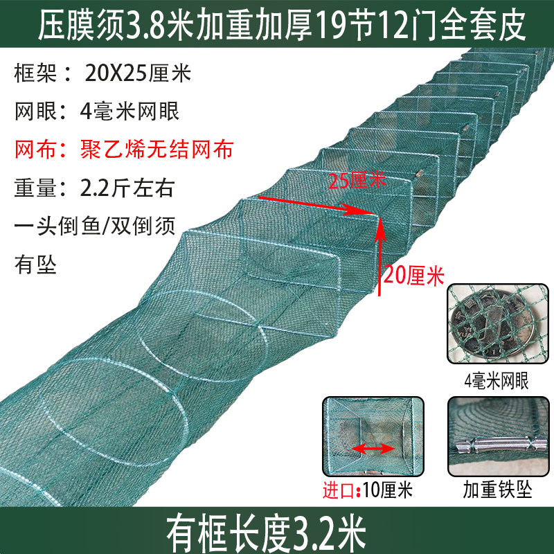 2到5米虾笼渔网是一种高效、环保的捕捞工具,广泛用于捕捉龙虾、黄鳝、泥鳅及各类淡水虾类。采用高强度尼龙或PE材料制成,结构坚固耐用,网眼设计科学,既能有效诱捕目标水产,又避免幼体误入,符合可持续捕捞理念。笼体长度通常在2至5米之间,入口采用倒须设计,鱼类进入后难以逃脱。使用时可搭配饵料投放于河流、池塘或稻田中,操作简便,收网省力。该虾笼适用于家庭捕捞、小规模养殖及休闲垂钓,是传统渔具中的优选产品,兼具实用性与经济性,深受渔民和垂钓爱好者喜爱。