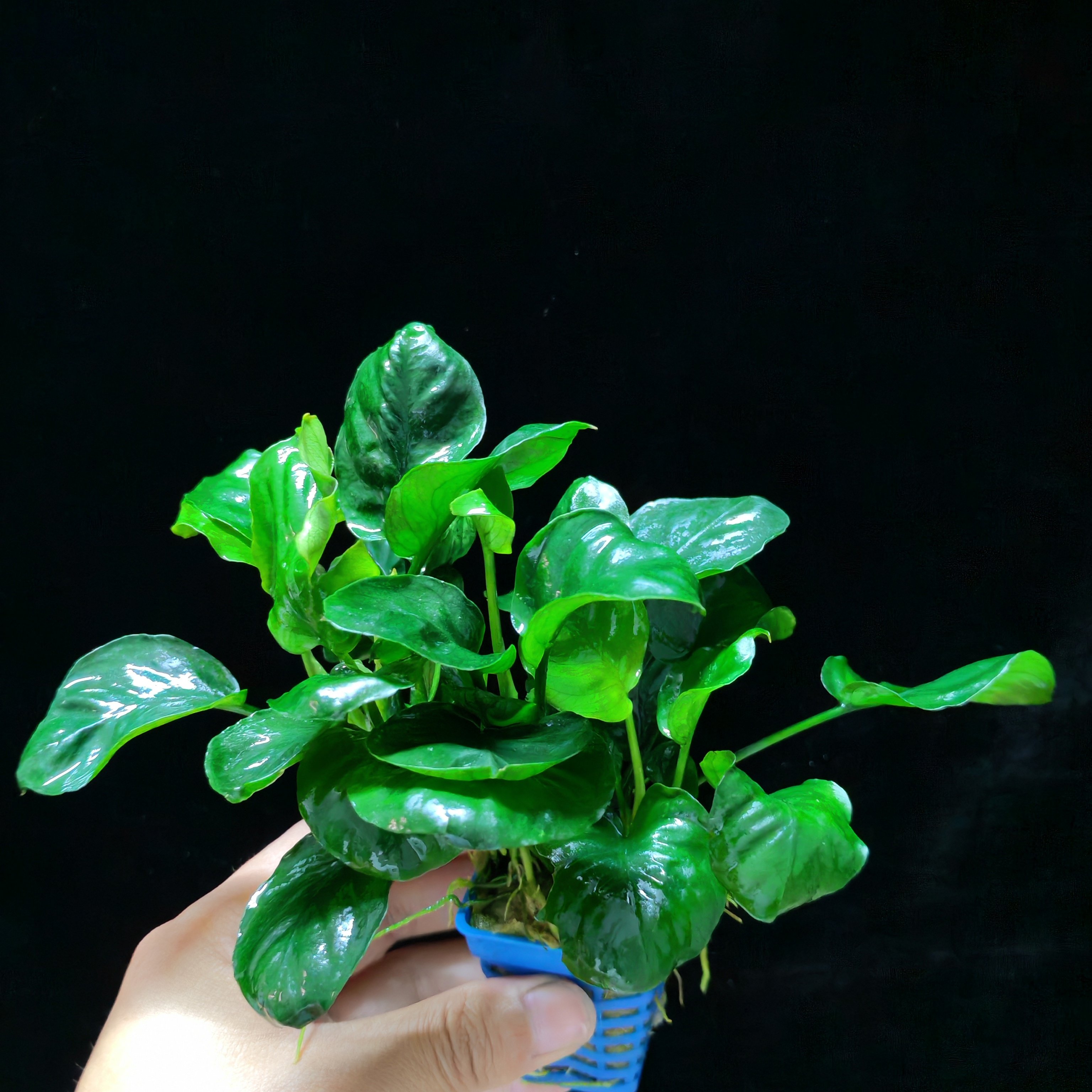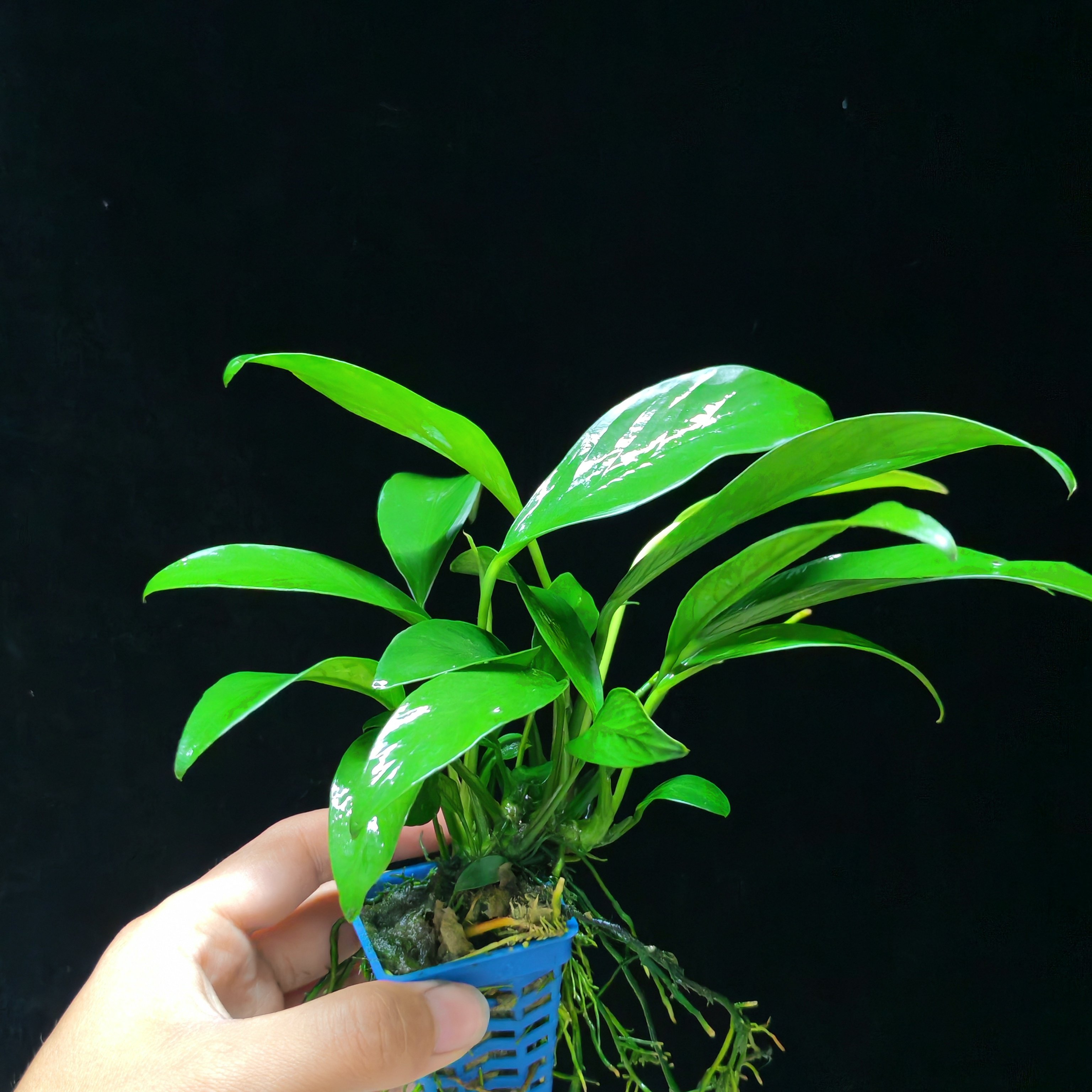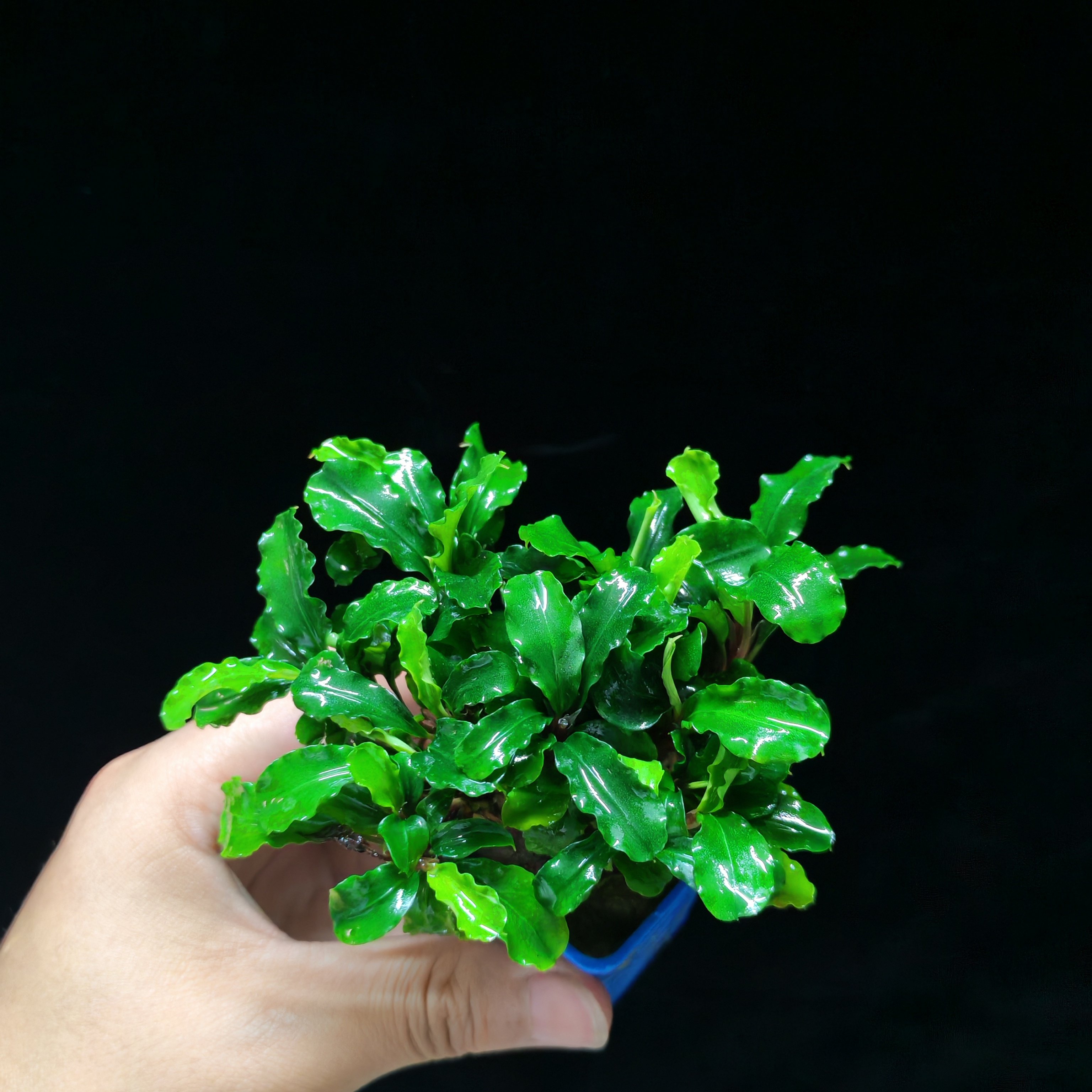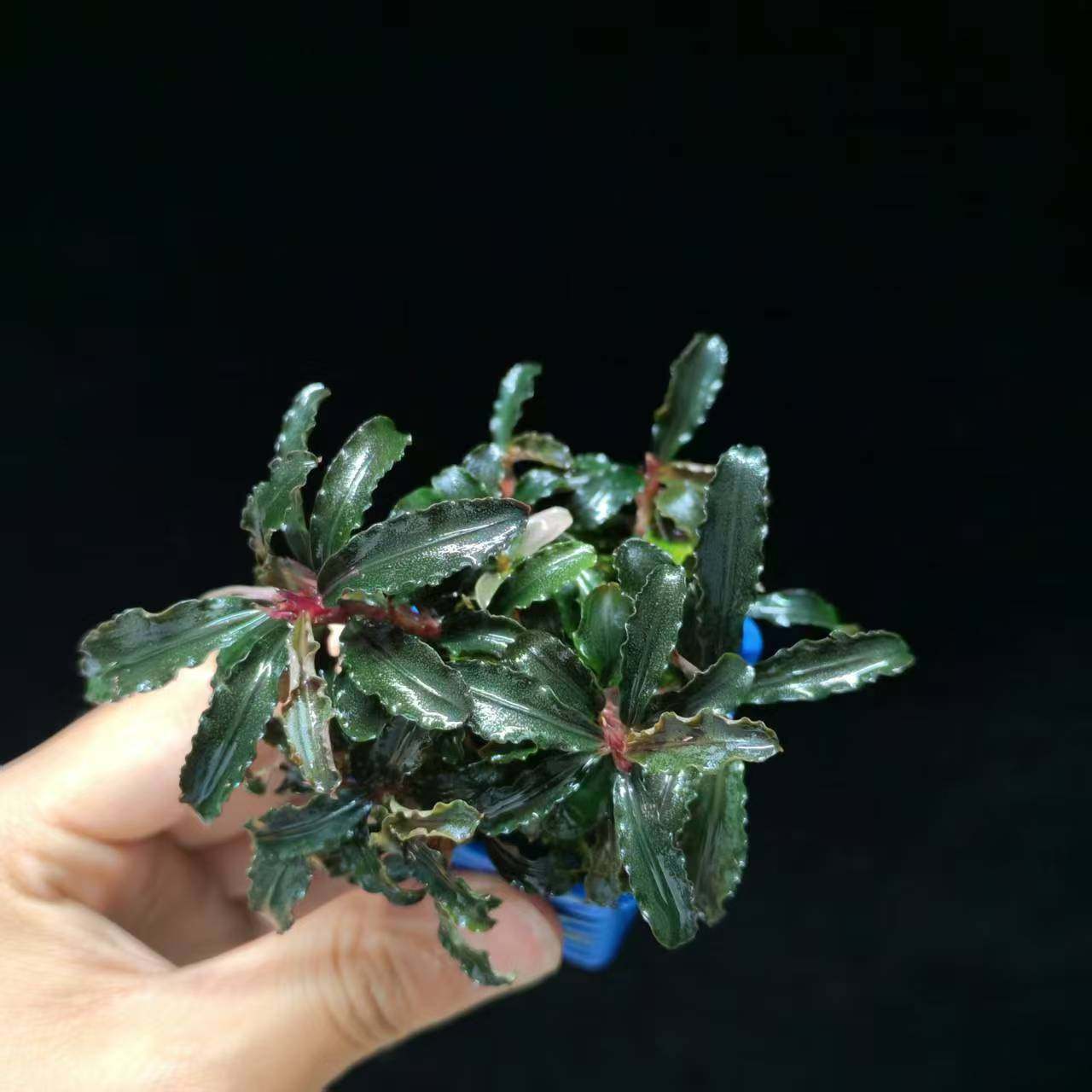 辣椒榕是一种极具观赏性的阴性水草,原产于东南亚热带雨林,常附生于沉木或岩石上,无需强光与二氧化碳即可良好生长,非常适合新手养护。其叶片厚实、形态优雅,颜色从翠绿到酒红不等,随光照和水质变化呈现丰富层次。搭配沉木或青龙石造景,能营造出自然野趣的水下森林景观。辣椒榕生长缓慢,抗逆性强,对水质适应范围广,只需定期添加液肥、保持水质稳定即可茁壮成长。作为活体水草,它不仅美化水族箱,还能吸收水中硝酸盐,维持生态平衡,是打造简约高效阴性草缸的理想选择。
