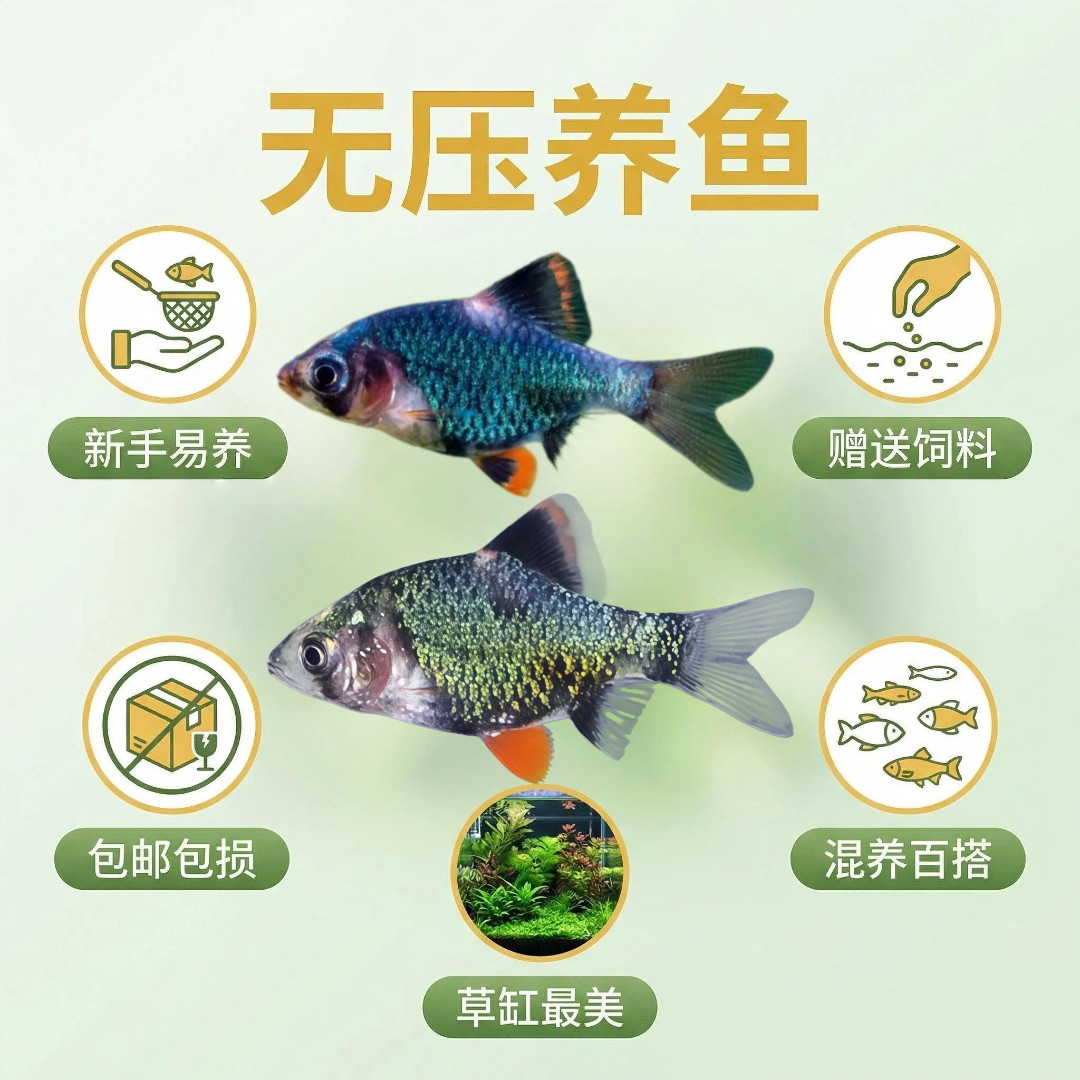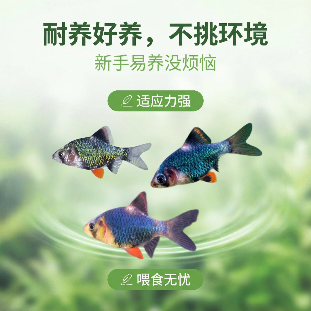 蓝虎皮鱼(又称绿虎皮鱼或翡翠虎皮鱼)是一种色彩艳丽的小型热带淡水观赏鱼,体长通常4-6厘米,体表带有鲜明的蓝绿色金属光泽与黑色条纹,部分品种在光照下呈现荧光效果,极具观赏价值。它们性格活泼、适应力强,对水质要求不高,适宜水温22-28℃,pH值6.0-7.5,非常适合新手饲养。蓝虎皮鱼杂食性,可摄食人工饲料、红虫、丰年虾等,繁殖较易,是水族箱中的活跃点缀。因其耐活、好养、群游性强,常与孔雀鱼、灯鱼混养,营造缤纷水景,是入门级观赏鱼的优选之一。