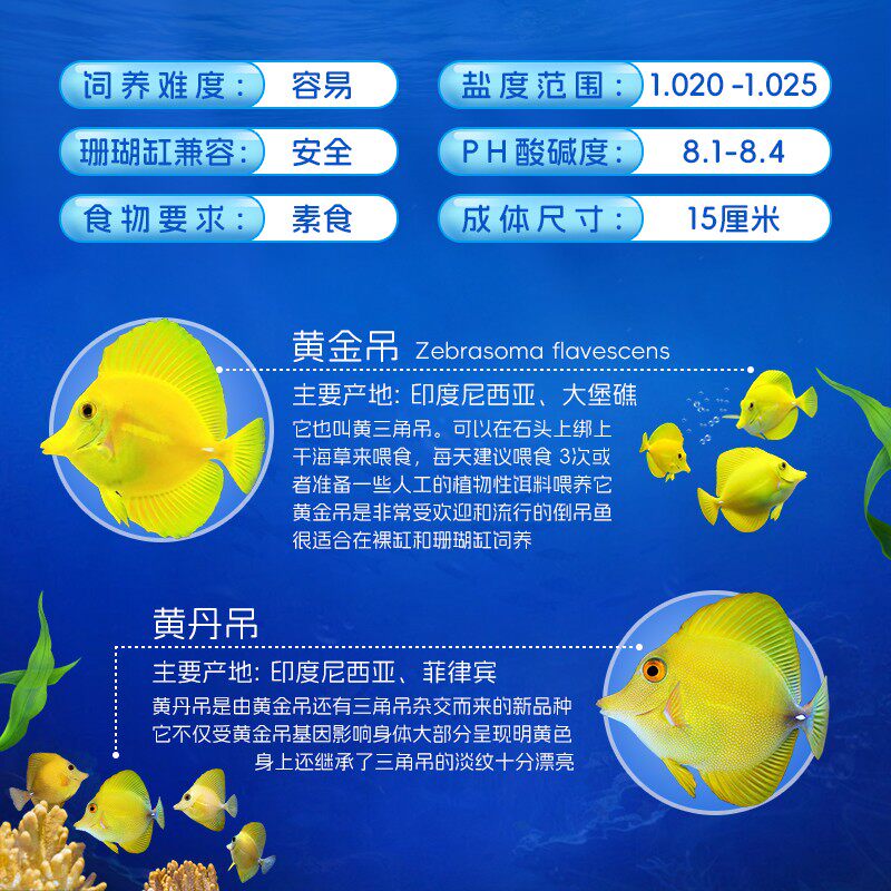 鸡心吊、黄金吊、珍珠吊、丝绒吊、医生火焰、黄丹吊等均为热门海水观赏鱼,适合饲养在成熟稳定的海缸环境中。这些吊类鱼色彩艳丽、体态优美,具有较强的领地意识,建议单独或成对饲养。其中,医生火焰(又称蓝毛吊)性格相对温和,适合混养;黄金吊与珍珠吊则需较大游动空间。所有鱼只均已通过专业检疫,确保健康无病,降低入缸风险。饲养时需维持水质稳定(比重1.023-1.025,pH8.1-8.4),并提供富含海藻的均衡饮食。建议搭配活石造景,模拟自然栖息环境,有助于减少应激,促进发色与健康成长。适合有一定经验的海水爱好者。