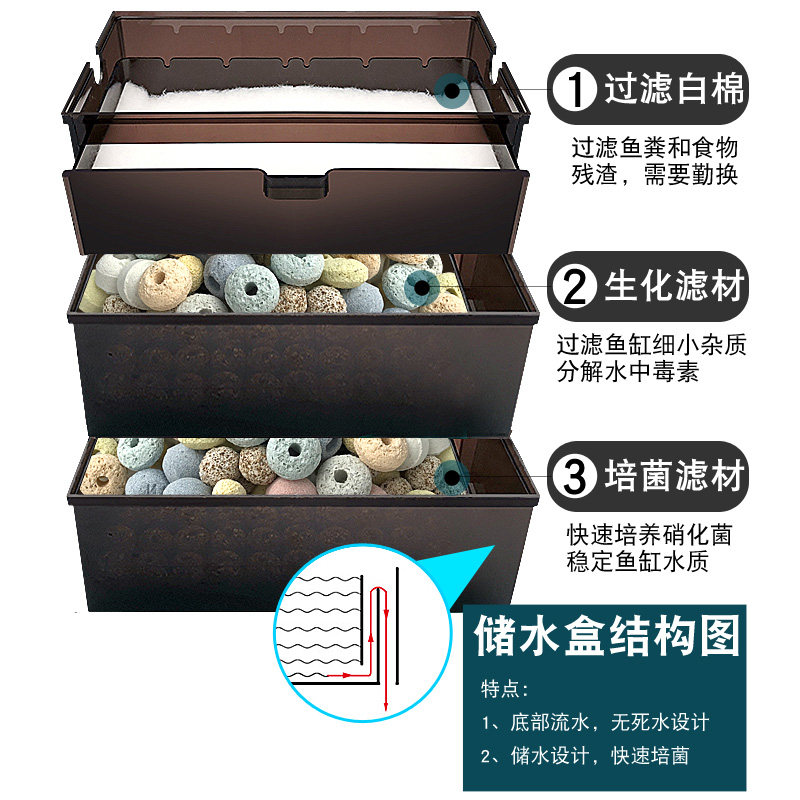 加大款滴流盒防溢流抽屉式大过滤盒鱼缸铝合金储水循环过滤系统,专为中大型鱼缸设计,采用高强度铝合金框架,坚固耐用且防腐蚀。抽屉式分层结构便于拆卸清洗,搭配多层过滤棉、生化棉及滤材,实现物理、生物双重高效过滤。底部设有防溢流装置,有效防止水溢出,保障使用环境安全。大容量储水设计增强水体循环效率,提升溶氧量,为鱼类营造健康生态。整体结构紧凑、安装简便,兼具美观与实用性,是提升鱼缸水质的理想选择,适用于家庭、办公室及水族馆等多种场景。