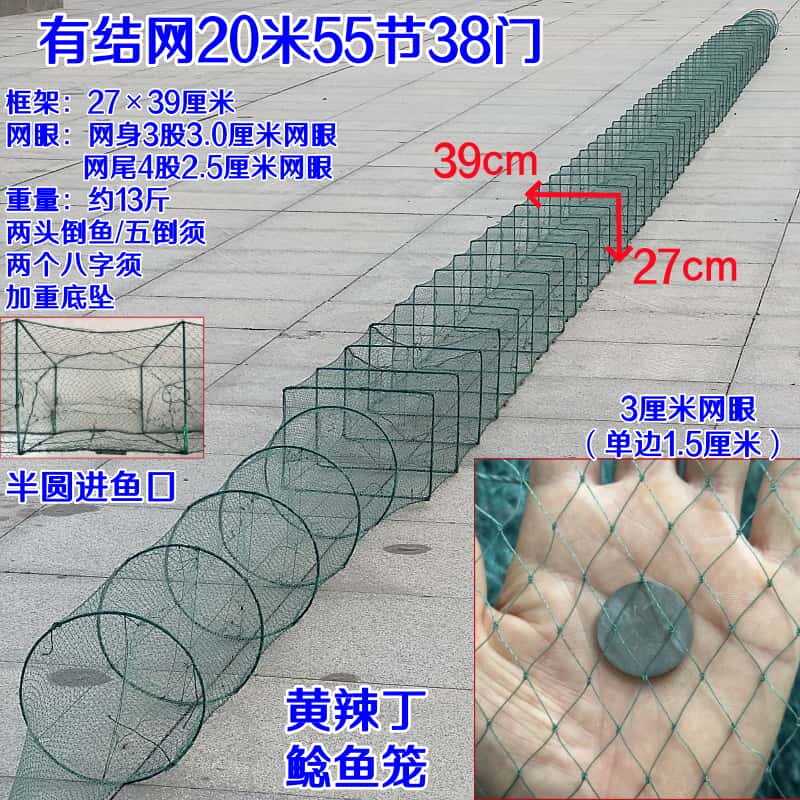 鲶鱼笼黄辣丁黄骨鱼昂刺鱼鲫鱼专用长地网鱼笼,是一款专为捕捉底层鱼类设计的有结网鱼笼。采用高强度聚乙烯网线编织,结构牢固、耐腐蚀,使用寿命长。笼体呈长筒形,配备多个单向入口,鱼类易进难出,有效提高捕获率。特别适用于捕捞黄辣丁、黄骨鱼、昂刺鱼、鲫鱼及鲶鱼等底栖鱼类,广泛应用于江河、湖泊、池塘等水域。其有结网设计增强抗拉扯能力,不易变形,透水性好,减少水流阻力。安装简便,可配合沉子与浮漂使用,适应不同水深环境。是渔民和垂钓爱好者高效捕鱼的理想工具。