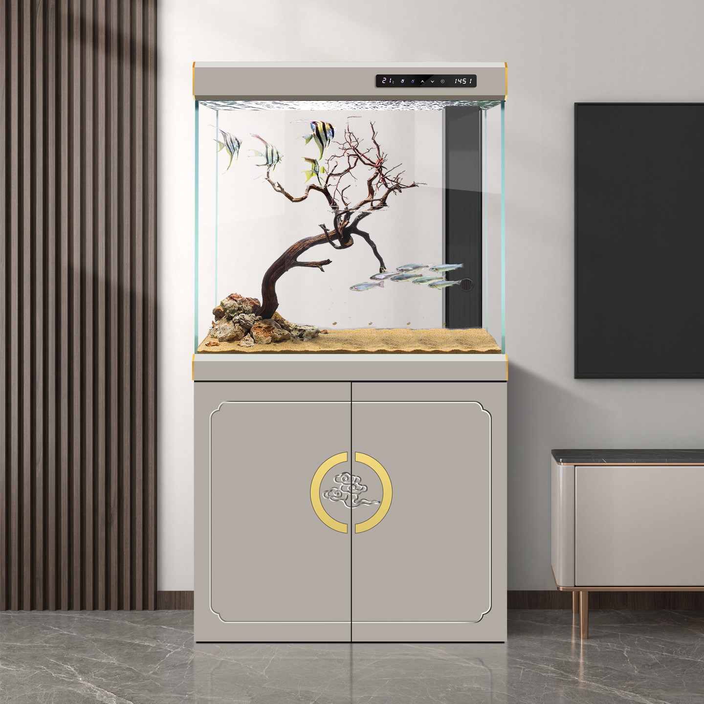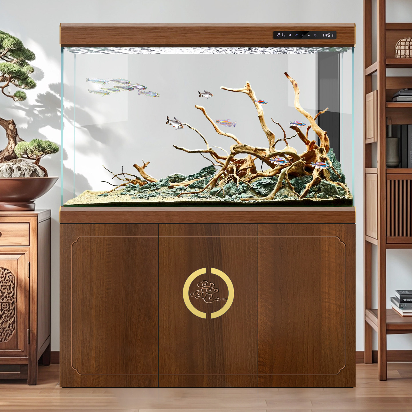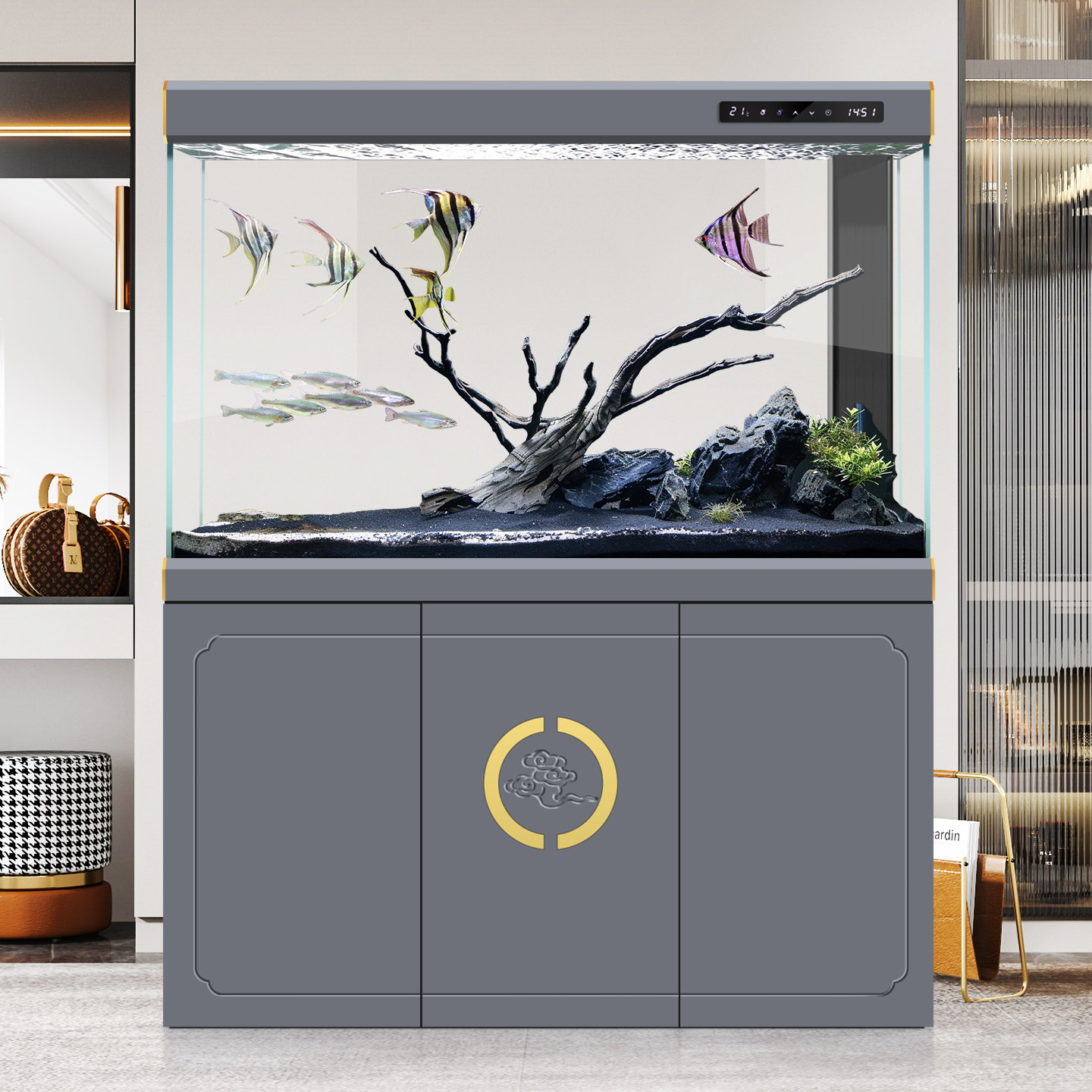 欧宝复古木纹超白龙鱼缸中式隔断柜屏风客厅水族箱落地缸家用大型