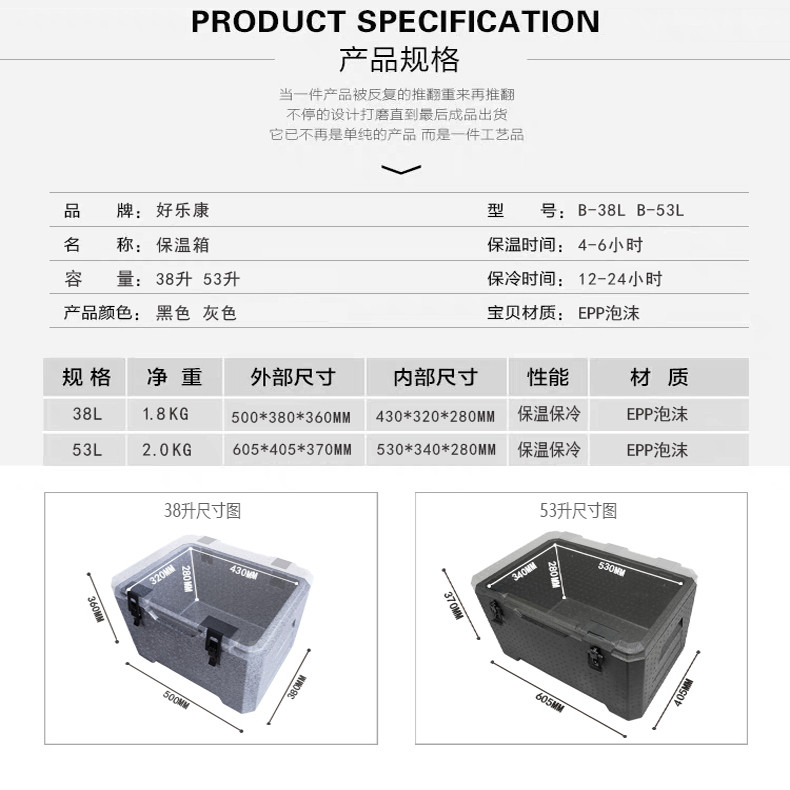高强硬度EPP泡沫箱采用环保高分子材料制成,具备出色的抗压、抗冲击性能,承重能力强,可直接坐人,安全可靠。其密度高、结构稳定,同时重量极轻,便于携带,是户外活动的理想选择。提供38升和53升两种容量,空间宽敞,可轻松收纳渔具、食材或装备,兼具冷藏保鲜功能。防水、防腐、耐高低温,适应各种恶劣环境。无论是钓鱼、露营还是短途旅行,这款EPP泡沫箱都能满足多功能需求,实现“一箱多用”,是追求轻便与耐用用户的优质之选。