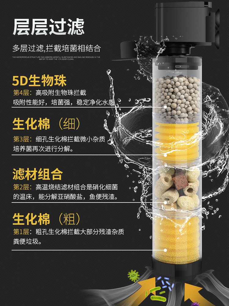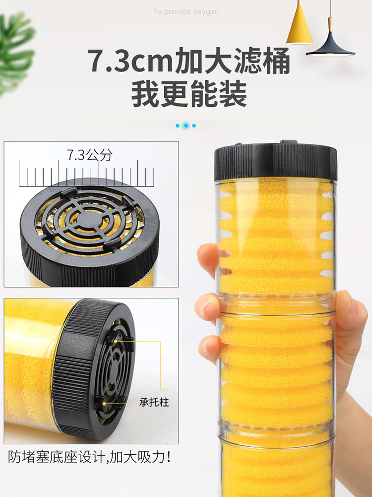 这款五合一鱼缸过滤器集过滤、净水、循环、增氧、吸便五大功能于一体,专为小型圆形鱼缸设计。内置静音潜水泵,高效运转同时保持低噪音,营造宁静观赏环境。多层过滤系统有效拦截杂质、培养有益菌群,实现水质长效净化,真正实现免换水维护。独特吸便设计可自动清理鱼粪残渣,减少缸内污染。同时持续增氧,提升水体溶氧量,保障鱼儿健康活跃。结构紧凑,安装简便,适用于30-80升小型鱼缸,是新手和忙碌养鱼者的理想选择,让养鱼更省心、更洁净、更省心。