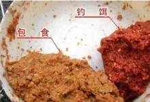 即钓钩先挂上黄豆般大小的面饵,外层再包裹上麦麸成球状。包食钓法具有悬坠钓中边钓边诱的诱钓合一的优势,先用诱饵将鱼先聚后钓的做法,容易造成鱼越钓越稀和窝点内无饵诱鱼的缺陷。改变了用饵不能雾化的缺点,左手抓起一团调好的包食诱饵,将上好钓饵的钩饵置于圆饼的中心,的主要分为包饵芯饵包饵的配制”将鱼颗粒饲料用加了几滴玉米香精的温水化开:到达钓场后再加入麸皮、炒黄豆粉、炒花生粉。