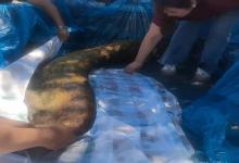 2025年5月16日,一条体型庞大的鱤鱼被捆绑在一辆越野车上,尽管有很多绳子在尽力拉扯,但是这条鱤鱼的鱼尾巴依旧差一点垂落到地面。