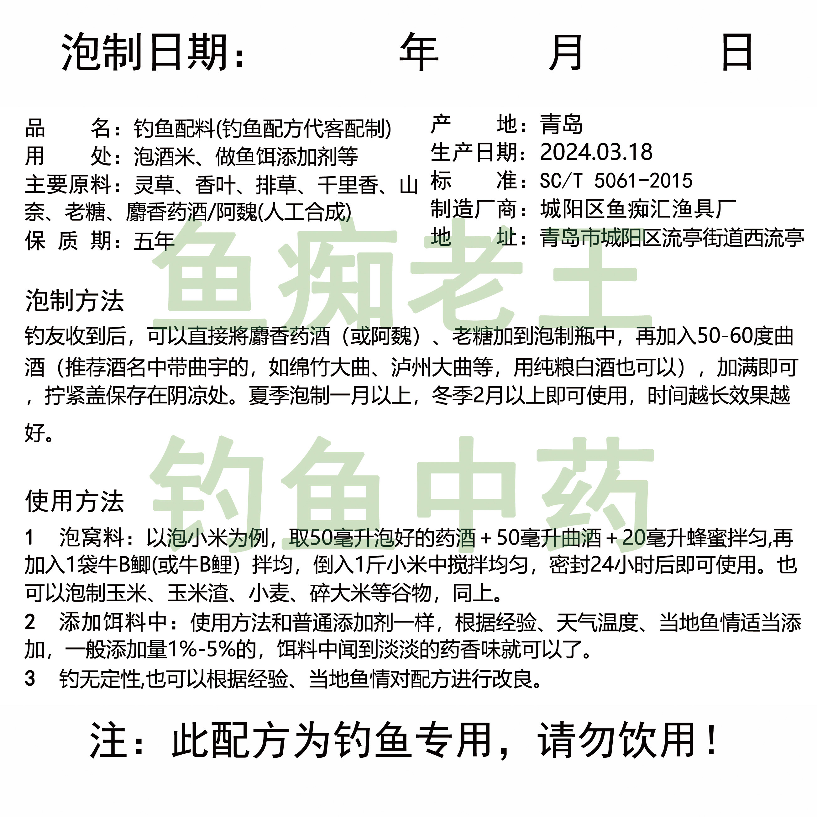 钓鱼中药材秘方小药黑坑鲤鱼青鱼草鱼饵料窝料谷麦回锅鱼爆护药酒