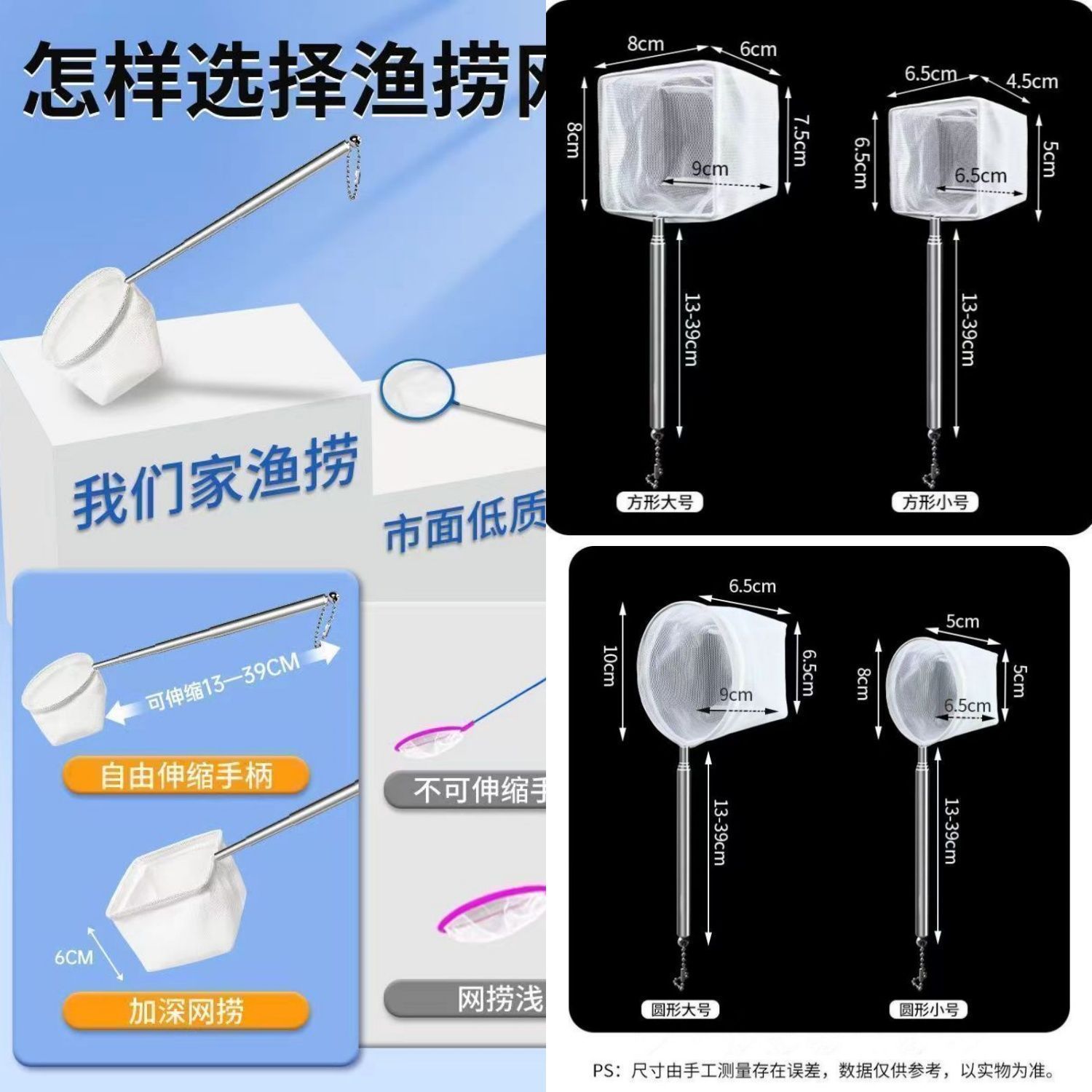 可伸缩式鱼捞水族箱抄网捞鱼网兜方形鱼捞握柄可伸缩水族网捞