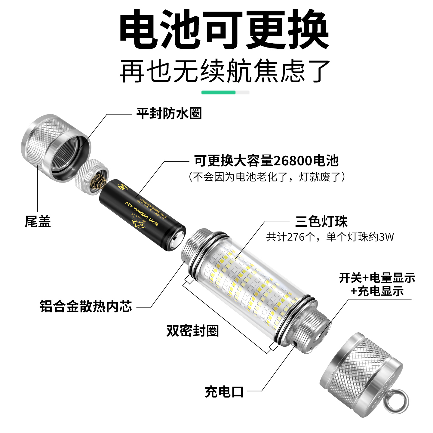 诱鱼灯水下专用强光超亮集鱼筏钓绿光是一款专为夜间海钓、捕鱼、船钓、鱿鱼夜钓等水下活动设计的强光钓鱼灯。该灯具有超强的亮度和防水性能,能够吸引鱼类聚集,提高钓鱼成功率。其特有的绿色光源不会对鱼儿产生刺激,让鱼儿放松警惕,更加容易上钩。该灯设计精巧,操作简单,是喜欢夜间垂钓的朋友们的必备神器。无论是专业钓鱼人士还是业余爱好者,这款钓鱼灯都是您最佳的钓鱼伴侣。
