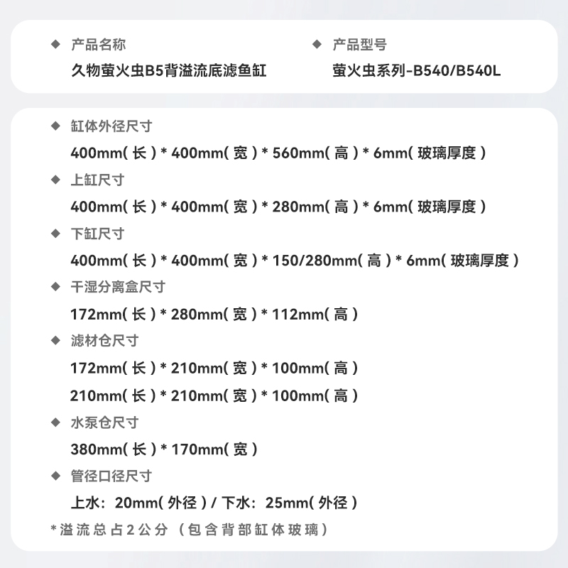 久物鱼缸萤火虫鱼缸B5是一款桌面一体原生底滤缸,是当下流行的网红鱼缸。其特点在于设计极窄且静音,配备抽屉式过滤系统,方便清洁和维护。该鱼缸采用优质材料制成,结构坚固稳定,使用寿命长。其一体式原生底滤设计能够确保水质清澈透明,为鱼儿提供一个健康舒适的生活环境。此外,鱼缸内置萤火虫照明系统,营造出浪漫温馨的氛围,适合放在桌面上作为家居装饰。总之,久物鱼缸萤火虫鱼缸B5是一款集美观、实用、健康于一体的鱼缸,是养鱼爱好者的理想选择。