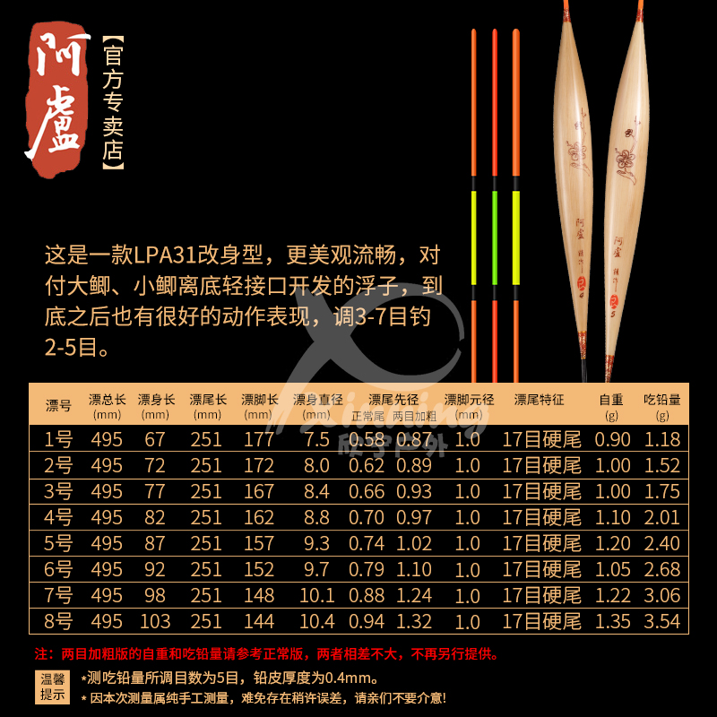 商品介绍:阿卢专卖LPA31B加长浮漂行程浮标是一款专为钓鱼爱好者设计的优质鱼漂。该产品采用芦苇材质,具有离底轻接口设计,加粗醒目,更加易于观察和使用。其加长设计可以提供更长的行程,帮助钓鱼者更准确地判断鱼儿的动态。无论是在江河湖泊还是池塘水域,这款浮标都能发挥出良好的性能,帮助钓鱼者更好地捕捉鱼类。是钓鱼爱好者不可或缺的钓鱼装备之一。