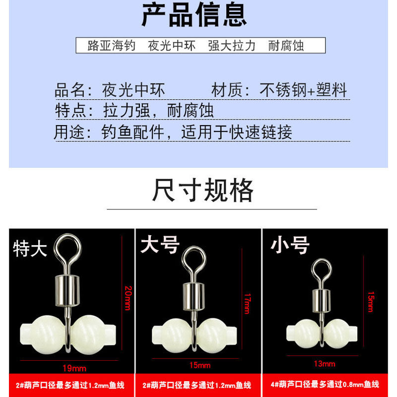 夜光葫芦转环八字环连接器是专为海钓设计的高效防缠绕钓组配件,集多功能于一体。其核心采用高强度不锈钢材质,搭配夜光涂层,夜间可自主发光,便于识别咬钩信号,提升夜钓体验。独特的葫芦形转环结构,有效分散水流冲击,减少钓组缠绕;八字环设计增强旋转灵活性,配合三叉串钩分叉器,使多钩钓组保持自然张开状态,提高中鱼率。适用于远投、沉底、船钓等多种海钓场景,尤其适合搭配串钩、爆炸钩使用。连接稳固、耐磨耐腐蚀,可快速组装拆卸,是专业钓手提升作钓效率的理想选择,让海钓更轻松、高效。