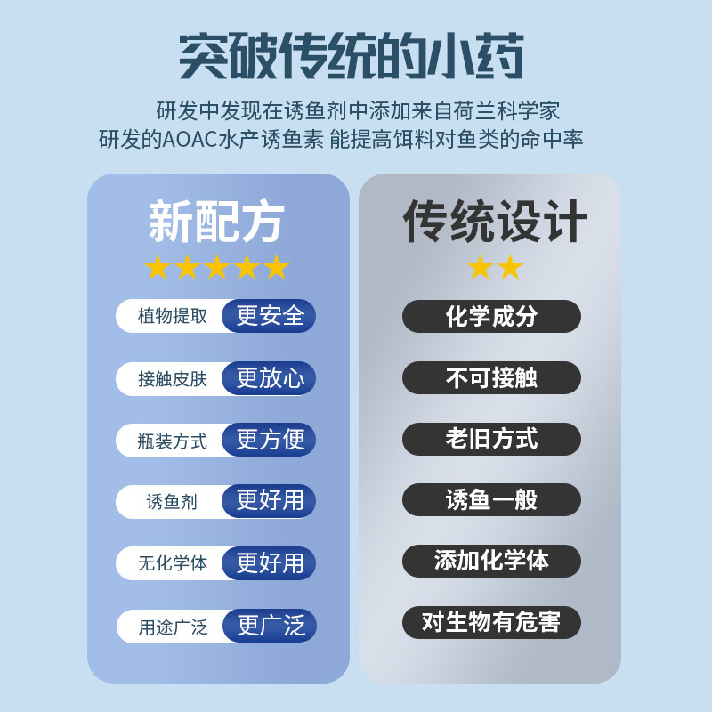 采用食品级安全配方,无毒无残留,不伤鱼体,兼容各类饵料、窝料及活饵(如蚯蚓、红虫),可大幅提升开口率。无论是黑坑竞技还是野钓,均能助你突破鱼情困境,实现爆护体验。**科学配比,天然诱食,让鱼无法抗拒!** (约200字)