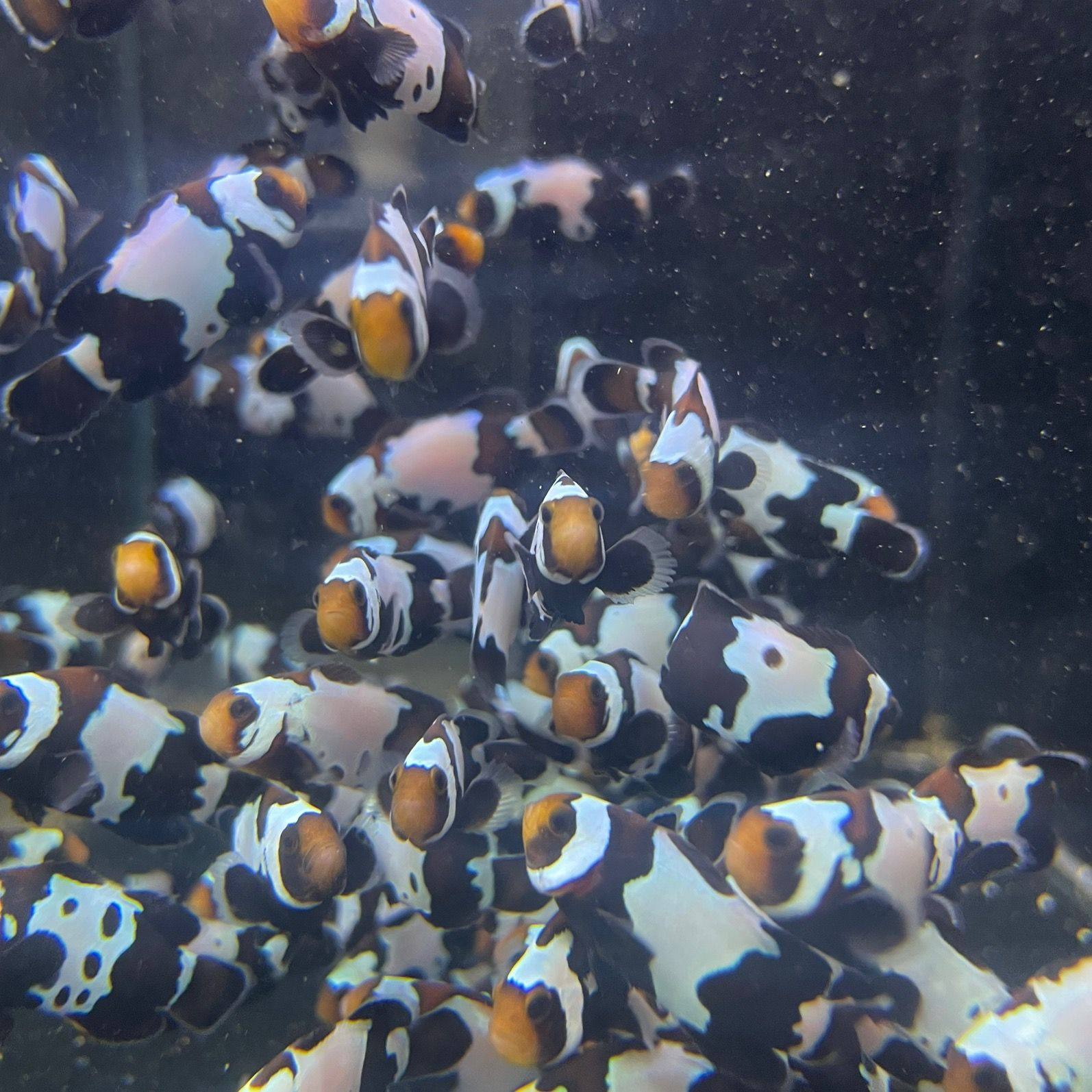 人工公子小丑鱼,又称黑边公子或奥黑毕加索小丑,是海水观赏鱼中的明星品种,以其独特的体色和活泼性格深受爱好者喜爱。其体表以亮眼的橙黄色为基底,搭配浓重黑色边缘的白色条纹,形成强烈视觉对比,部分个体更带有不规则黑斑或雪花状斑纹,如“雪印”般独特,极具艺术美感。该鱼种源自热带珊瑚礁海域,适应人工海水环境,性格温和,适合与海葵共生。经多年人工繁育,抗病力强、成活率高,是家庭海水缸的理想选择。其色彩鲜艳、姿态灵动,不仅能提升水族箱观赏性,也展现了海洋生物的奇妙多样性,是海水生物爱好者不可错过的精品观赏鱼。