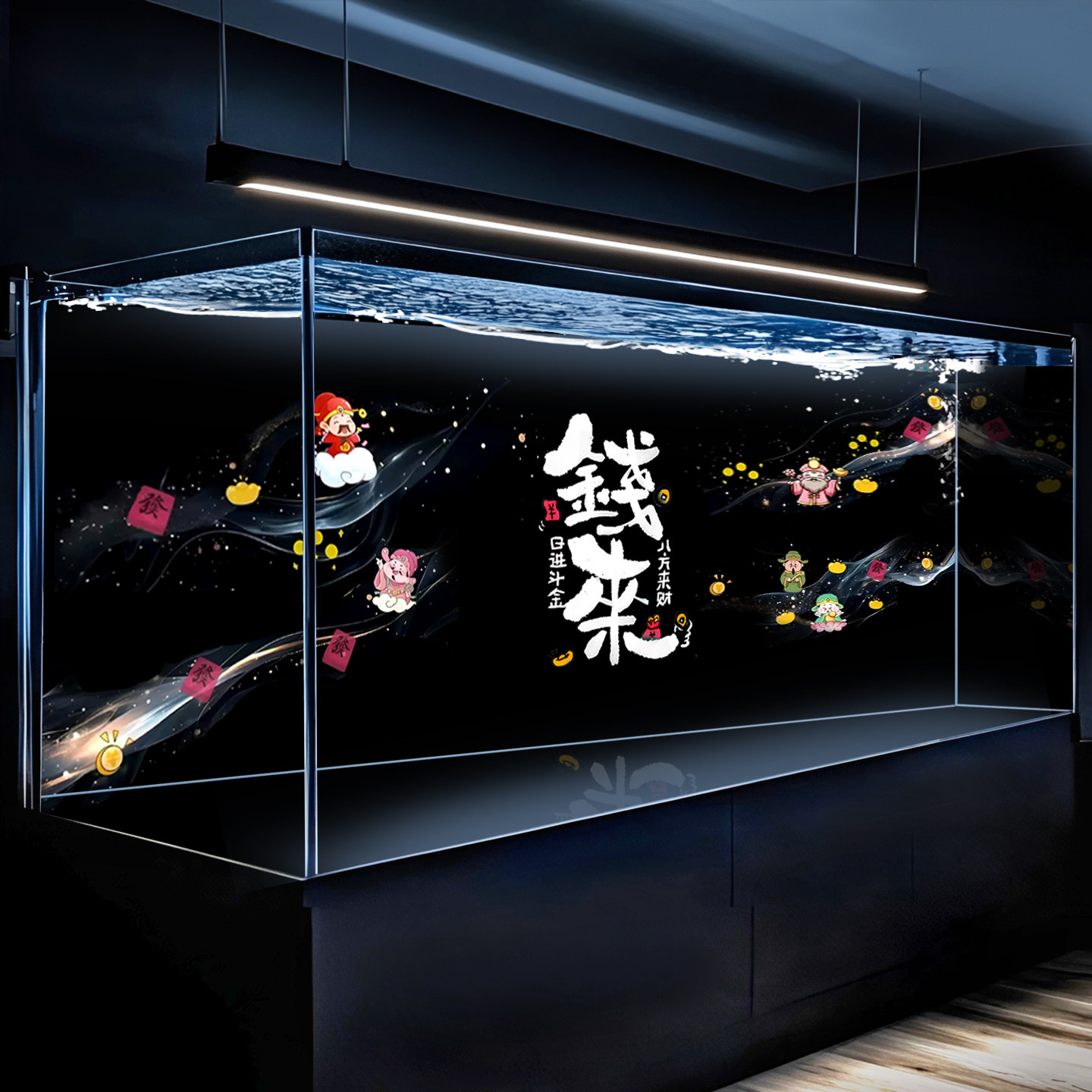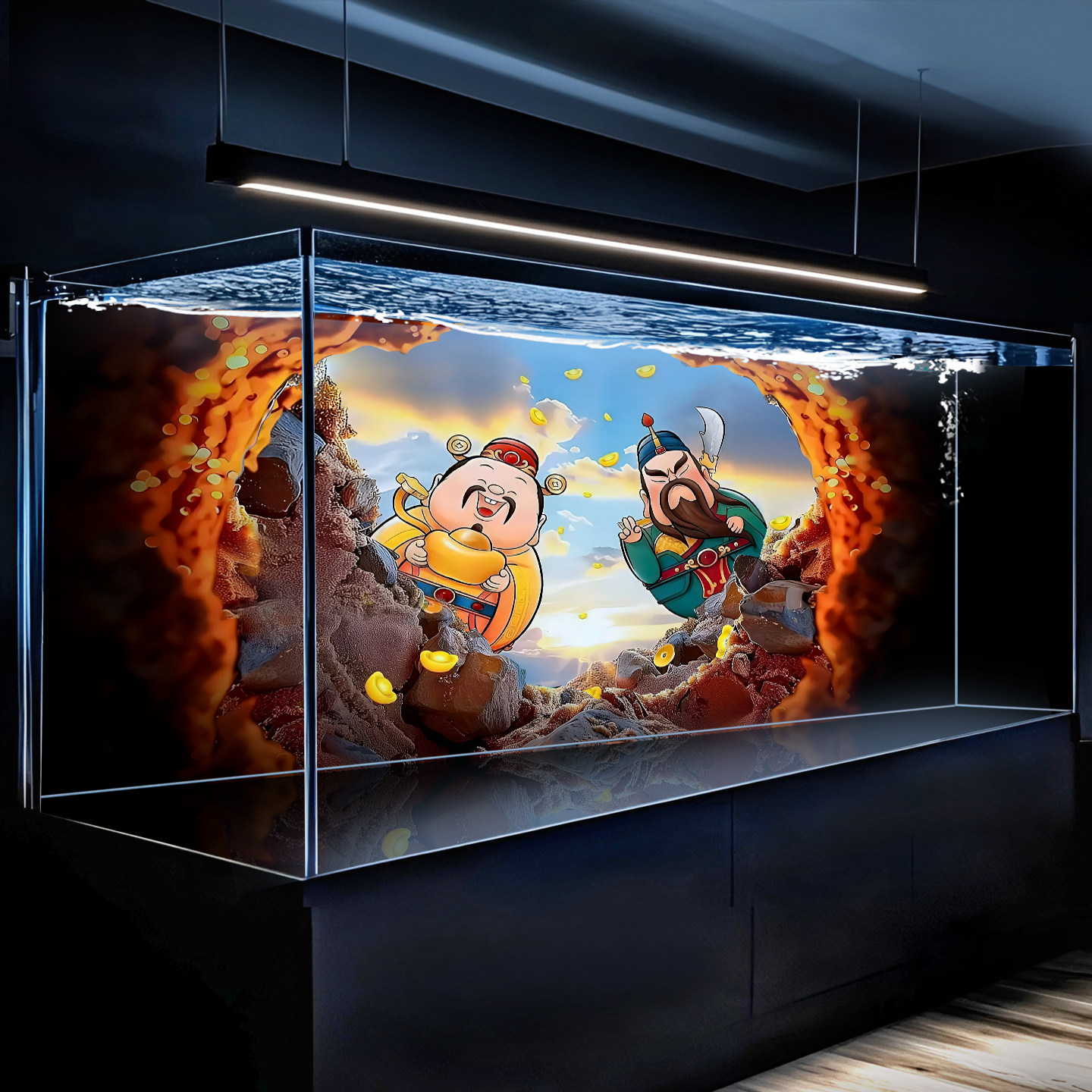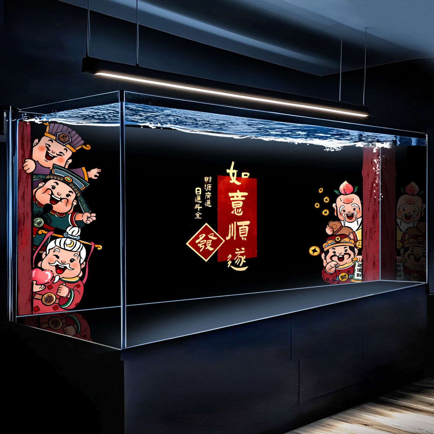 淘宝鱼缸背景画纸定制招财进宝八方来财财神龙鱼兰寿超白缸贴纸高清图