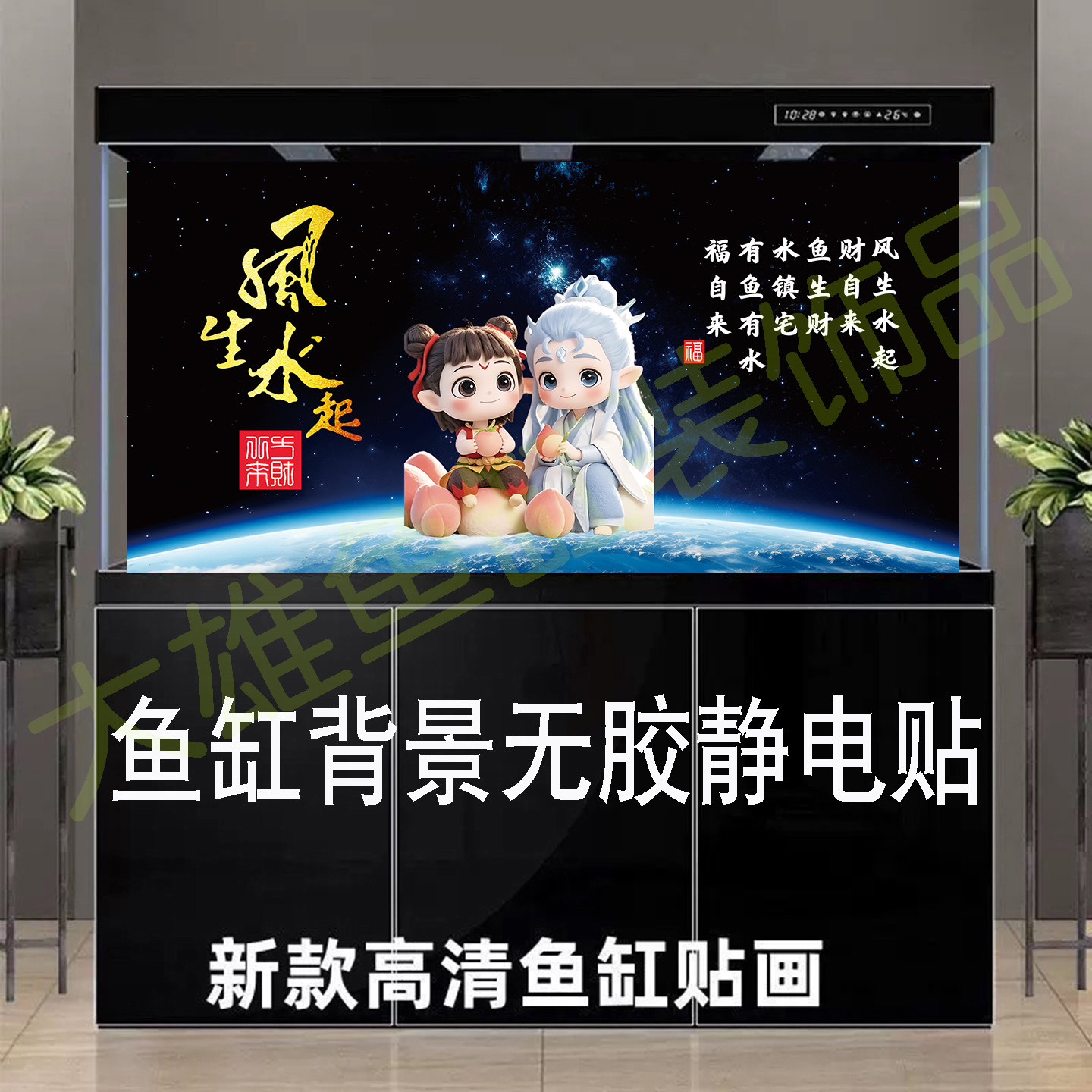 淘定制鱼缸背景贴纸黑色背景膜画高清图壁纸5d立体风生水起大圣荷花