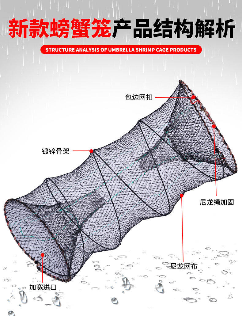 弹簧笼、甲鱼笼、黑鱼笼、鲫鱼笼、渔网地笼、折叠捕鱼花篮、虾笼、螃蟹笼等是常见的便携式捕鱼工具,广泛应用于淡水及浅海捕捞。这些笼具多采用高强度钢丝或尼龙网制成,结构稳固、透水性好,内置诱饵室与倒须设计,能有效诱捕鱼类、虾蟹等水生生物。其中,弹簧笼和折叠花篮便于携带与收纳,适合户外垂钓或小型捕捞作业;地笼则适合长时间布设于河流、湖泊底部。产品设计兼顾效率与环保,减少对水域生态的破坏,是渔民和休闲垂钓者的实用之选。