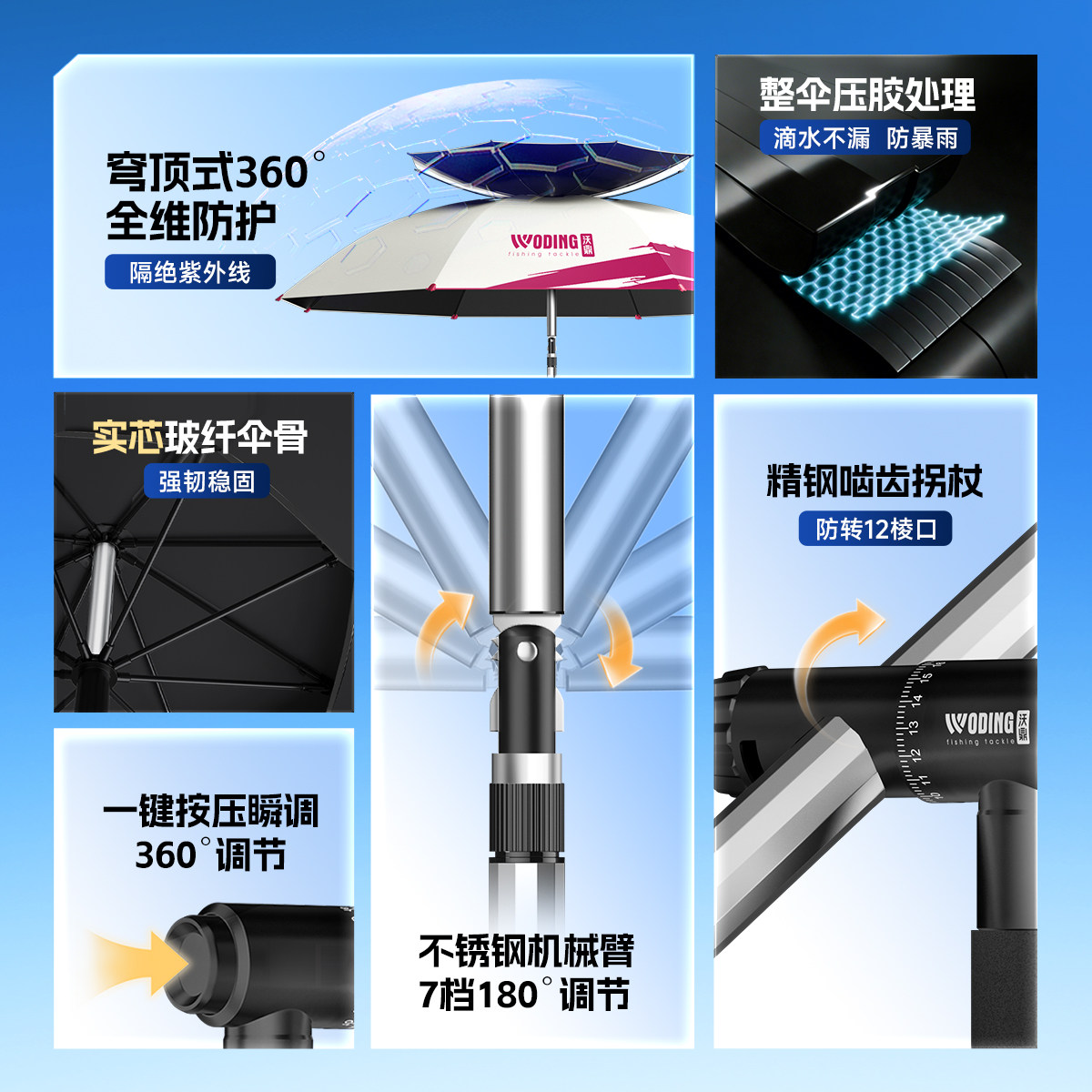 沃鼎钓伞2026新款专为户外垂钓设计,集遮阳、防雨、防风于一体。采用高强度铝合金骨架与加厚防紫外线涂层伞布,有效阻隔99%以上紫外线,防晒防雨性能卓越。创新机械臂结构搭配可调节拐杖底座,稳固支撑且高度自由调节,适应多种地形。伞面直径达2米,覆盖面积大,为钓者提供宽敞舒适空间。轻量化设计便于携带,一键开合操作便捷。无论是烈日暴晒还是突降阵雨,沃鼎2026都能守护您的垂钓时光,是户外钓鱼爱好者的理想装备。