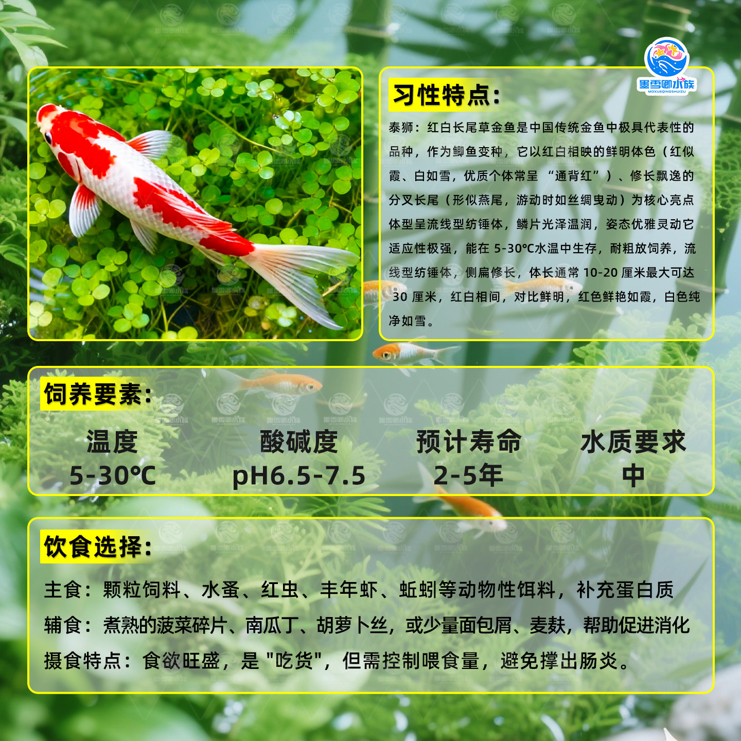 红白草金(又称红白锦鲫)是一种常见的冷水观赏鱼,属于淡水鱼中的小型鱼种,是草金鱼与锦鲤的杂交或选育品种。其体色以鲜艳的红色与纯白为主,色彩对比鲜明,游姿优雅,极具观赏价值。适应性强,耐寒耐温差,适合在室外的鱼池或室内水族箱中饲养,对水质要求不高,易于打理。因其性情温和、抗病力强,是新手养鱼的优选。红白草金不仅寓意吉祥(“金玉满堂”),还能为庭院或居室增添生机与雅趣,是深受喜爱的传统观赏鱼之一。