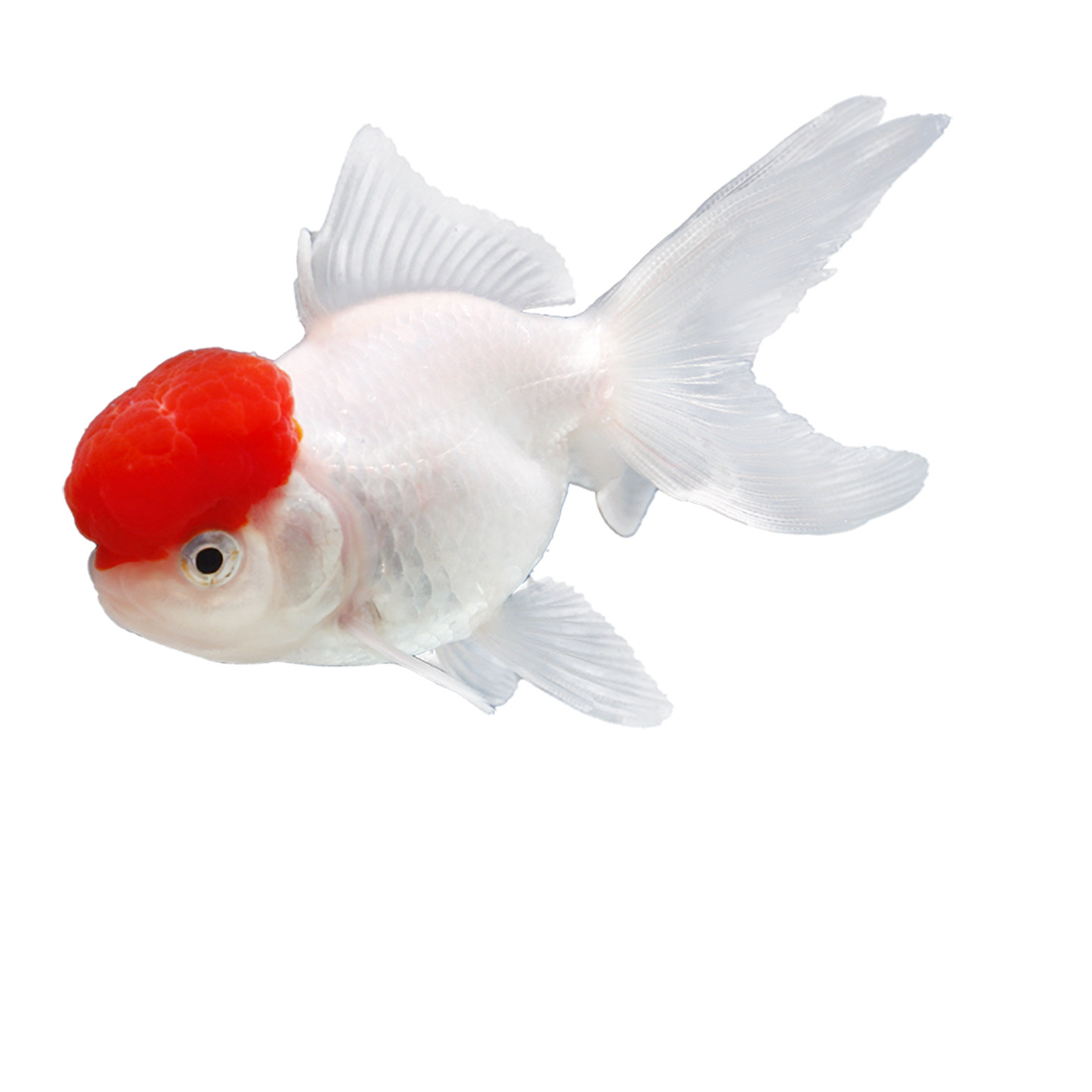 鹤顶红金鱼是一种极具观赏价值的淡水冷水鱼,以其鲜艳的红色头顶和洁白如雪的身躯著称,宛如丹顶鹤般优雅,故得此名。它属于红狮子头丹顶品种,头部肉瘤饱满隆起,色彩鲜红亮丽,游姿雍容华贵,深受金鱼爱好者喜爱。鹤顶红适应性强,耐寒耐活,对水质要求不高,非常适合初学者饲养。在适宜的环境中,它们生长稳定、抗病力强,寿命较长。无论是单独饲养还是搭配其他金鱼,都能为水族箱增添一抹灵动与喜庆。因其寓意吉祥、红运当头,也常被作为风水鱼或馈赠佳品。