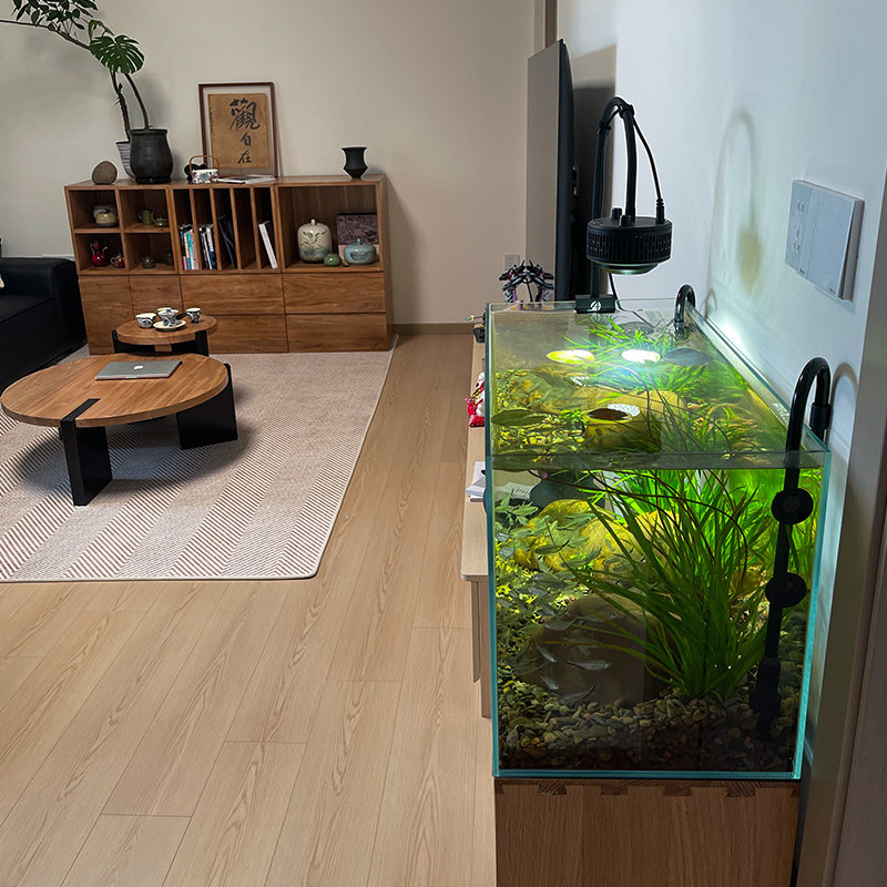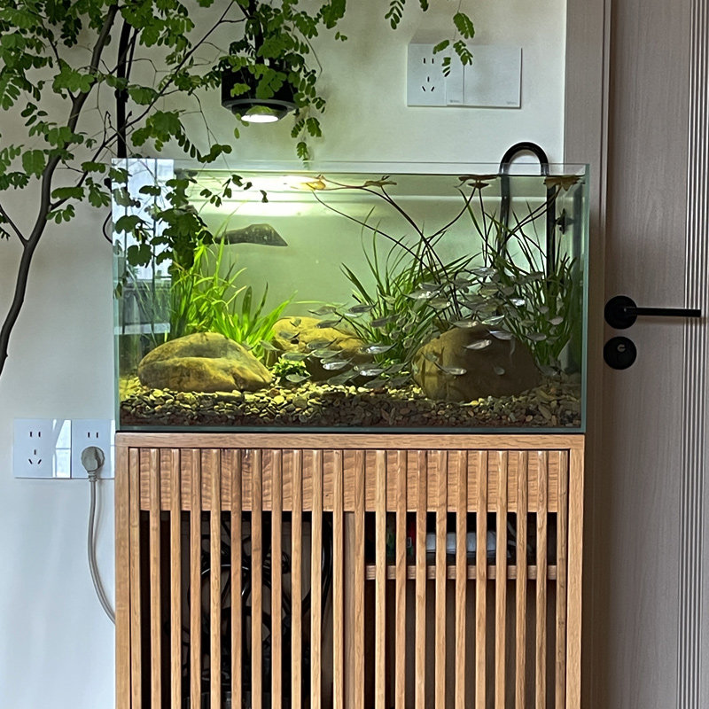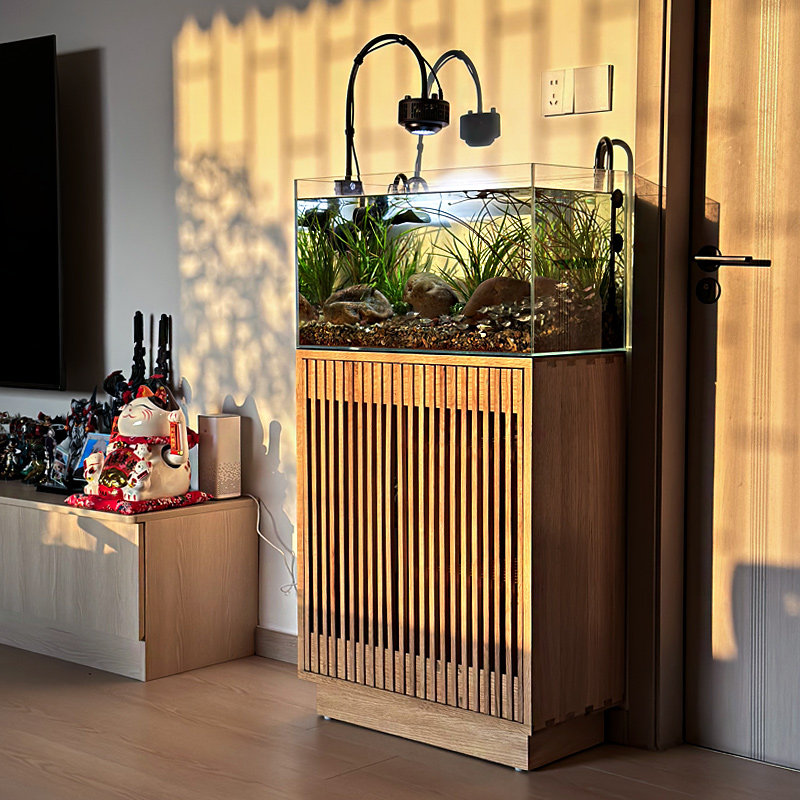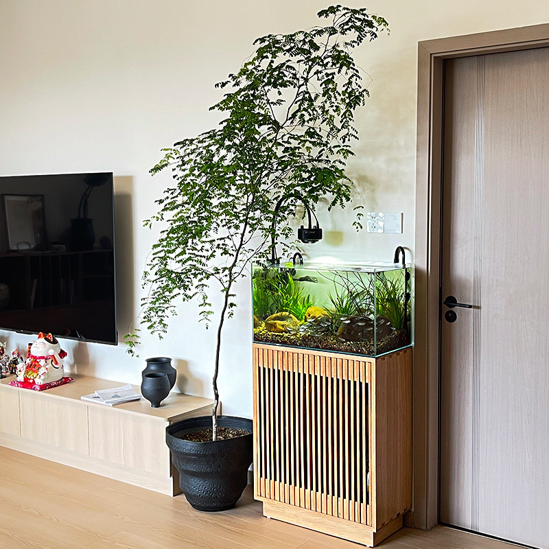物喜一侘原木风客厅生态鱼缸,融合自然美学与现代工艺,采用优质红橡实木定制底柜,结构稳固,质感温润,完美契合侘寂风格。一体式造景设计,将沉木、水草与石材巧妙搭配,营造出静谧自然的微型生态景观。缸体采用自循环过滤系统,实现水体自动净化,低维护、高观赏性。红橡实木纹理清晰,与玻璃缸体相得益彰,既彰显原木质朴之美,又提升空间格调。适用于客厅、茶室等空间,不仅是一处生态景观,更是一种生活态度的表达,让自然悄然融入日常,带来宁静与治愈的居家体验。