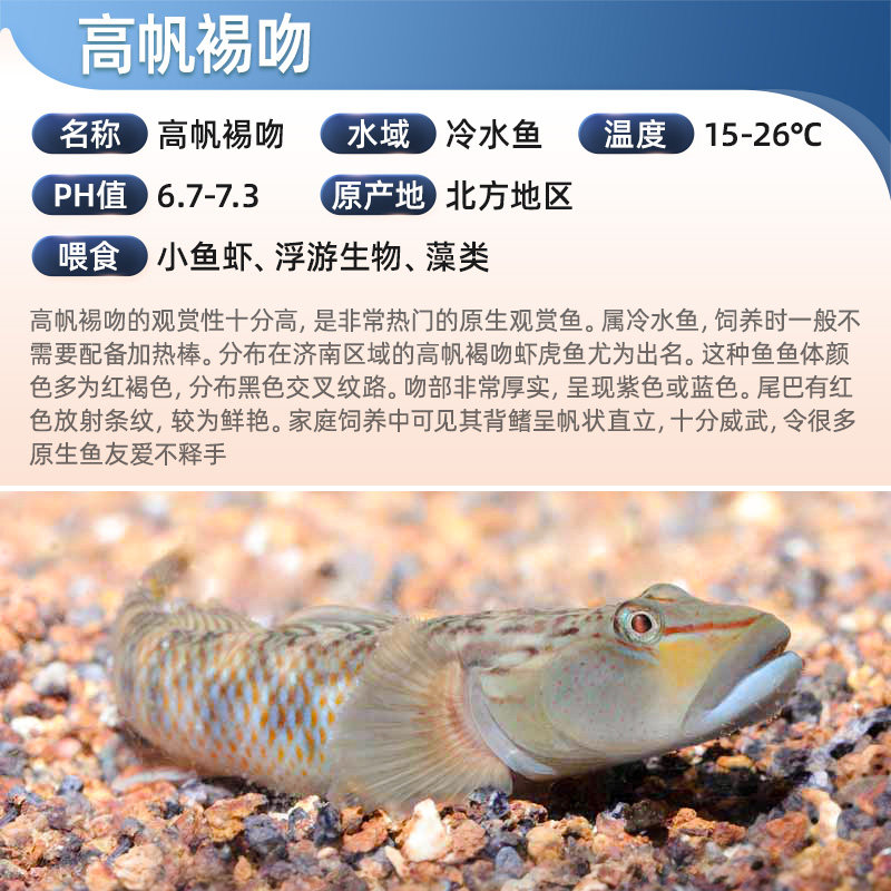 高帆裼吻虾虎鱼是一种原生冷水观赏鱼,体型小巧,色彩独特,常见于我国南方山区清澈的溪流环境中。作为小型淡水鱼,它们适应低温环境,无需加温设备,非常适合家庭水族箱或生态溪流缸饲养。性格温和,喜栖息于沙石底质、水流较缓的区域,杂食性,易于投喂人工饲料或小型活饵。对水质要求不高,耐寒性强,冬季在10–20℃水温下仍能健康生长。因其活泼好动、群游性强,且能有效控制藻类,成为冷水观赏鱼中的热门选择。饲养简单,成活率高,是新手和资深鱼友的理想伴侣鱼。