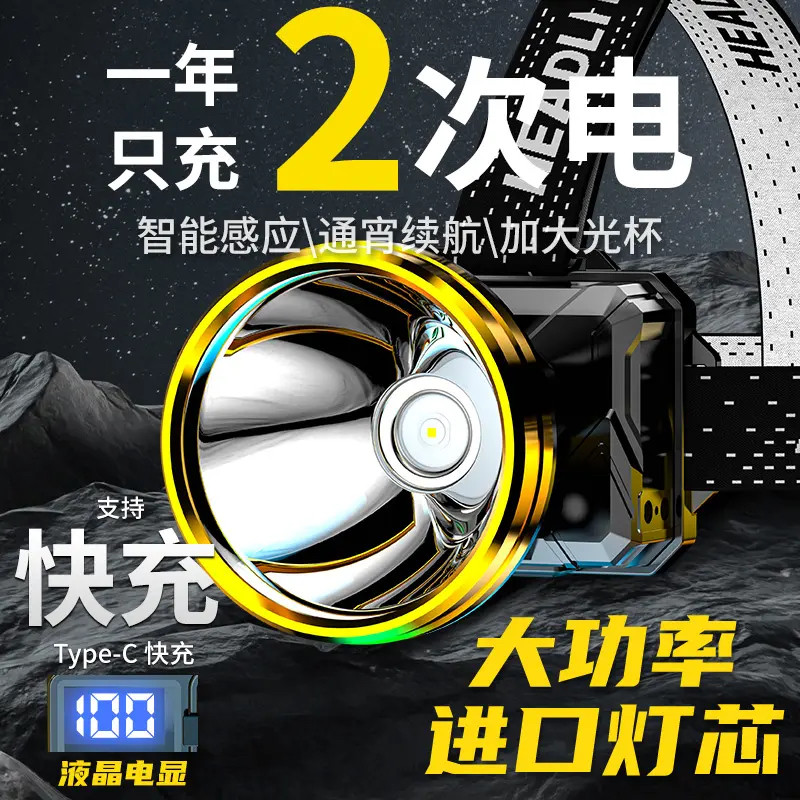 头灯2025新款强光超亮头戴式超长续航锂电户外夜钓鱼专用感应矿灯
